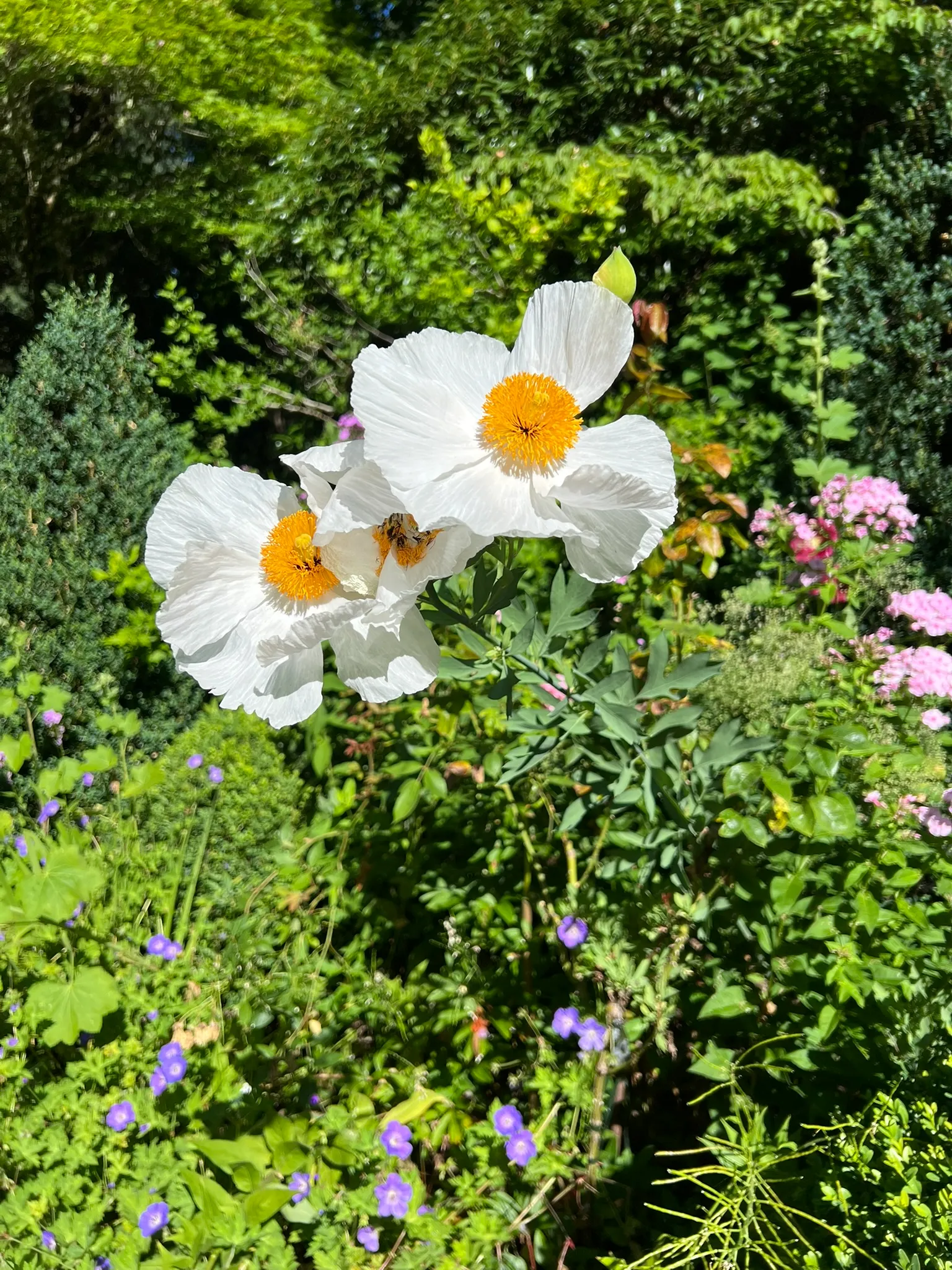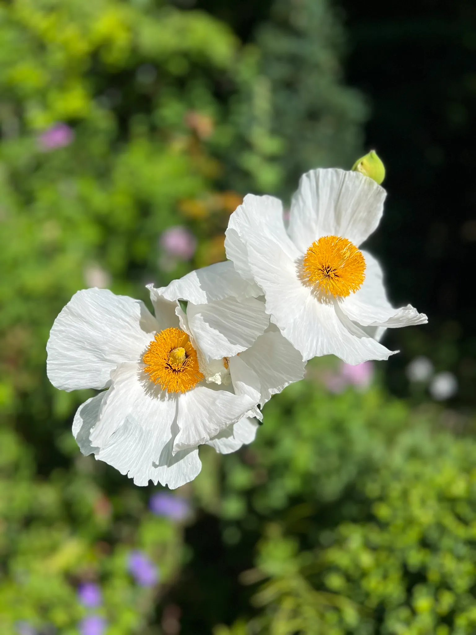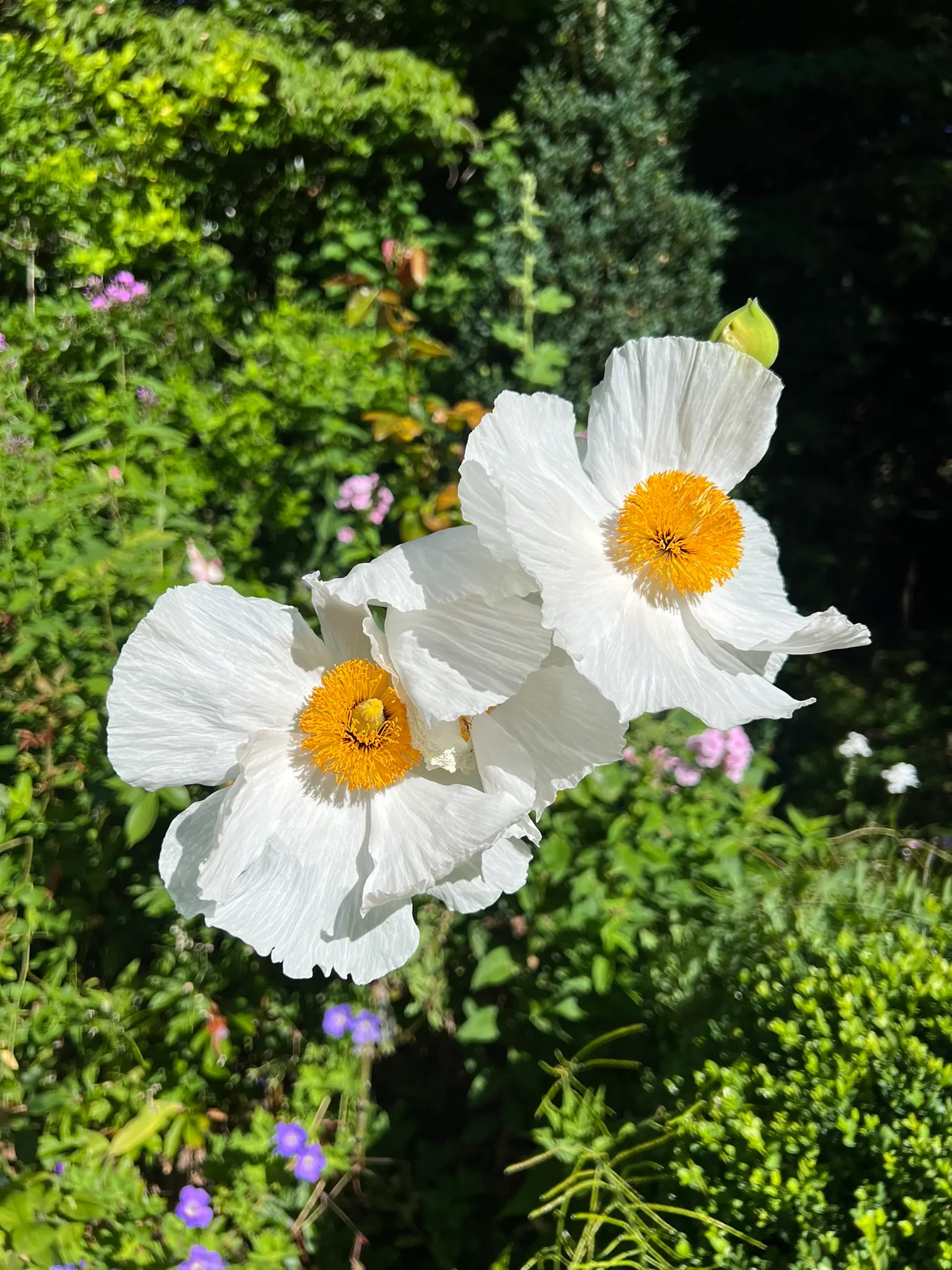 A large, spreading, semi-woody perennial subshrub in the family Papaveraceae, native to the chaparral, dry canyons, and coastal scrub of southern California and Baja California, Mexico. Plants establish slowly from the root but eventually form extensive spreading colonies 4–8 feet (1.2–2.4 m) tall and 6 feet (1.8 m) or more wide via deep, wide-spreading rhizomes. The deeply pinnately lobed, blue-gray to glaucous leaves 3–6 inches (8–15 cm) long are attractively textured and provide year-round structure in mild climates. From late May through July, the plant produces the largest flowers of any native North American perennial: bowl-shaped blooms 4–9 inches (10–23 cm) across with six to nine crinkled, papery white petals surrounding a prominent boss of golden-yellow stamens, resembling a fried egg — giving rise to the common nickname 'fried egg plant.' The flowers have a light, pleasant fragrance. Romneya coulteri is fiercely drought-tolerant once established but deeply intolerant of disturbance: it virtually cannot be transplanted after establishment, and spreading rhizomes are extremely difficult to contain or remove. Mildly toxic if ingested (alkaloids in foliage and sap).