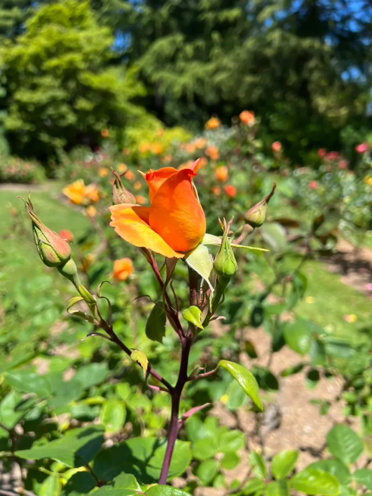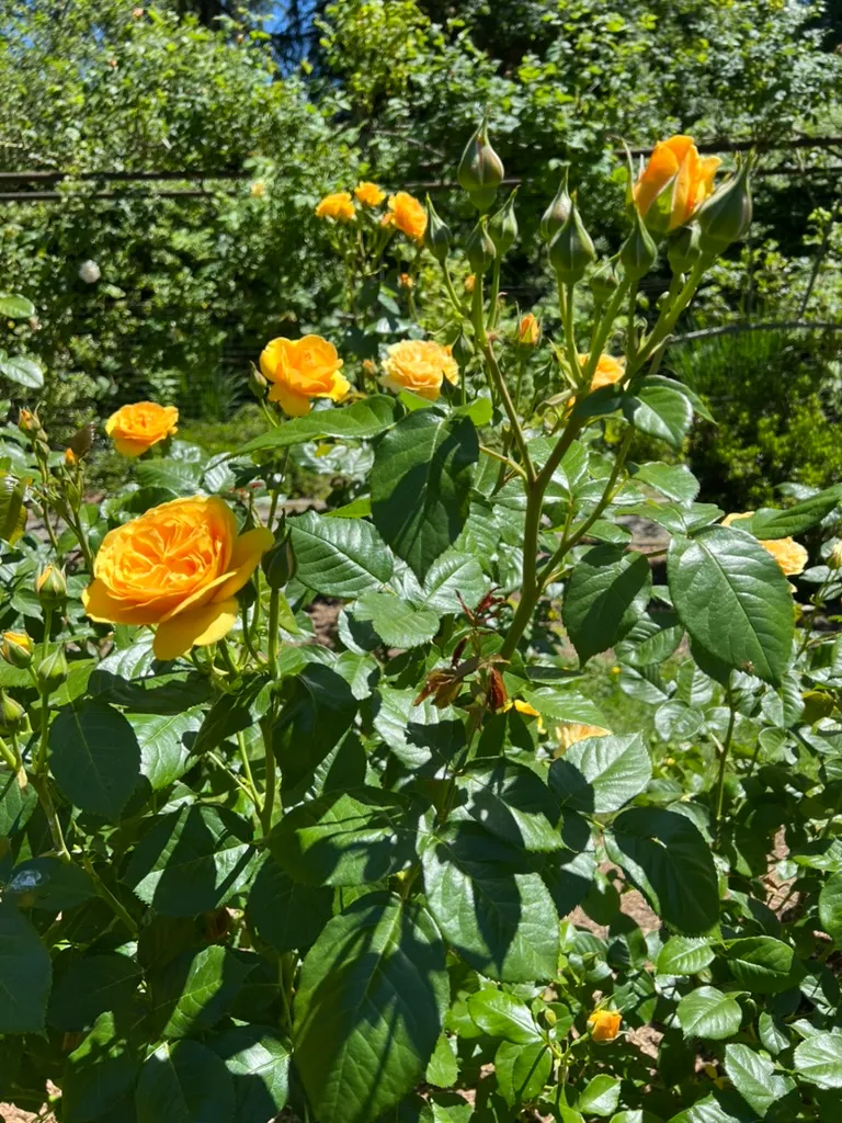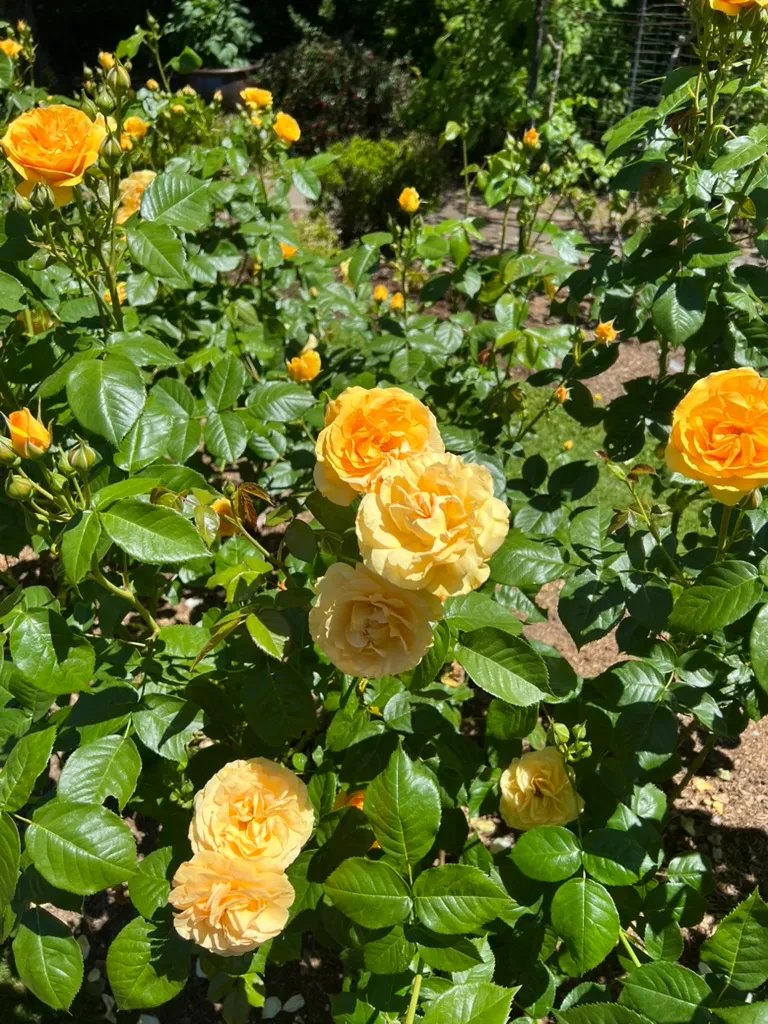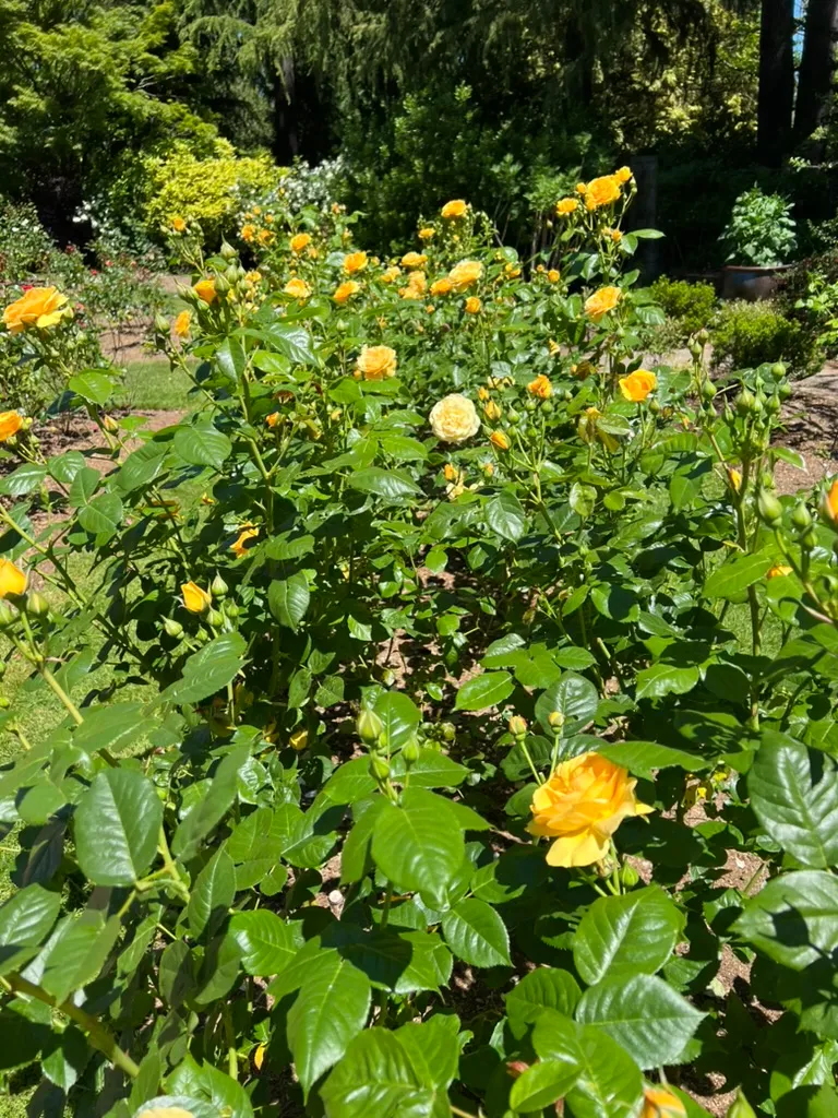 Floribunda roses are a class of Rosa hybrids reaching 2-4 feet (0.6-1.2 m) tall with a spread of 2-3 feet (0.6-0.9 m), developed in the early 20th century by crossing hybrid tea roses with polyantha roses. The name means 'many-flowered,' and the class is characterized by flowers produced in large clusters (sprays) of 3-15 or more blooms per stem, providing a continuous mass of color. Individual flowers range from single (5 petals) through semi-double to double (25-30 petals), 2-3.5 inches (5-9 cm) across — smaller than hybrid teas but far more numerous per stem. Flower forms are typically less formal and high-centered than hybrid teas, with a more open, cupped, or rosette shape. Available in the full range of rose colors: white, pink, red, yellow, orange, apricot, lavender, and bicolors. Many are fragrant, though generally less intensely than hybrid teas. Leaves are alternate, pinnately compound, with 5-7 glossy, serrate leaflets. Growth habit is bushy, compact, and well-branched. Repeat-blooming from late May through October in the Pacific Northwest. Generally more disease-resistant and cold-hardy than hybrid teas, and lower-maintenance overall. First officially recognized as a class by the American Rose Society in 1952. In the Pacific Northwest, black spot, powdery mildew, and rust are persistent concerns; disease-resistant cultivars are strongly recommended.