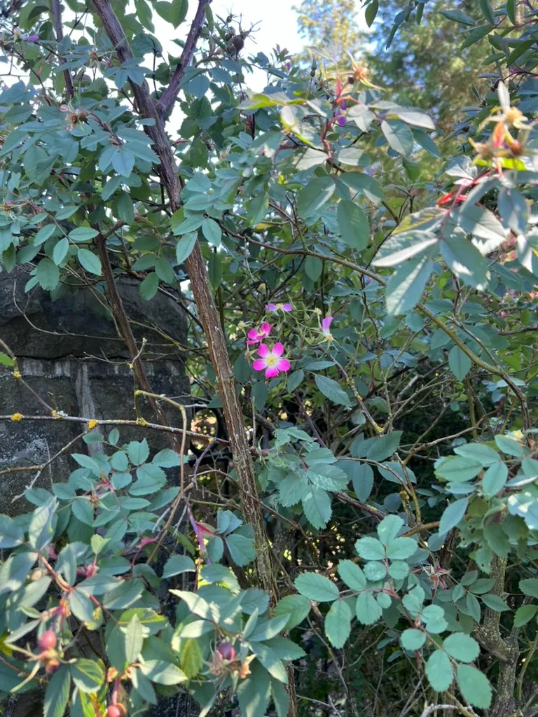 Rosa glauca (syn. Rosa rubrifolia) is a deciduous species rose reaching 5-8 feet (1.5-2.4 m) tall with a spread of 4-6 feet (1.2-1.8 m), developing an upright, arching, vase-shaped form. This species is grown primarily for its foliage rather than its flowers — a rarity among roses. Canes are reddish-purple, smooth, and nearly thornless, with a waxy bloom. Leaves are alternate, pinnately compound, with 5-9 small, elliptic leaflets, each 1-2 inches (2.5-5 cm) long. Foliage color is the primary ornamental feature: a striking glaucous blue-gray to coppery-purple, with the exact shade depending on sun exposure — more purple in full sun, more blue-gray in shade. Flowers are single, 5-petaled, 1-1.5 inches (2.5-4 cm) across, clear pink with a white eye and prominent yellow stamens, borne in small clusters of 2-5 in June. Flowers are modest and short-lived but attractive. Fruit (hips) are small, round, dark red, 0.5 inch (13 mm) across, produced abundantly and persisting through winter. Growth rate is moderate at 12-18 inches (30-46 cm) per year. Among the most disease-resistant of all roses; essentially immune to black spot and powdery mildew. Self-seeds moderately; seedlings are true to type. A Great Plant Picks recommendation for the Pacific Northwest.