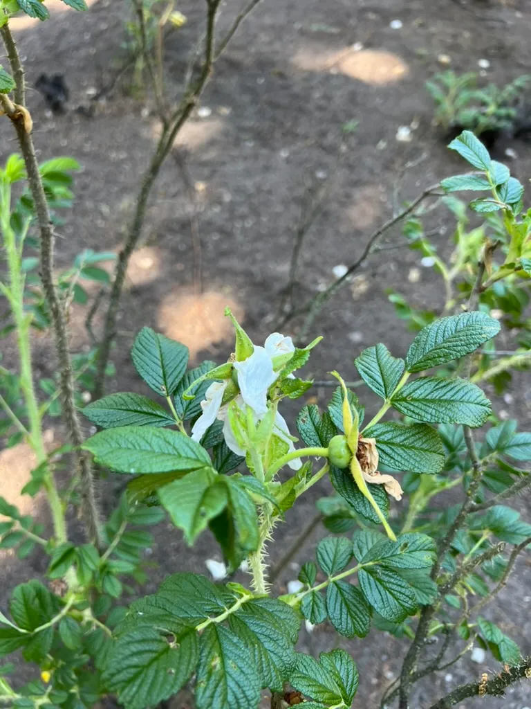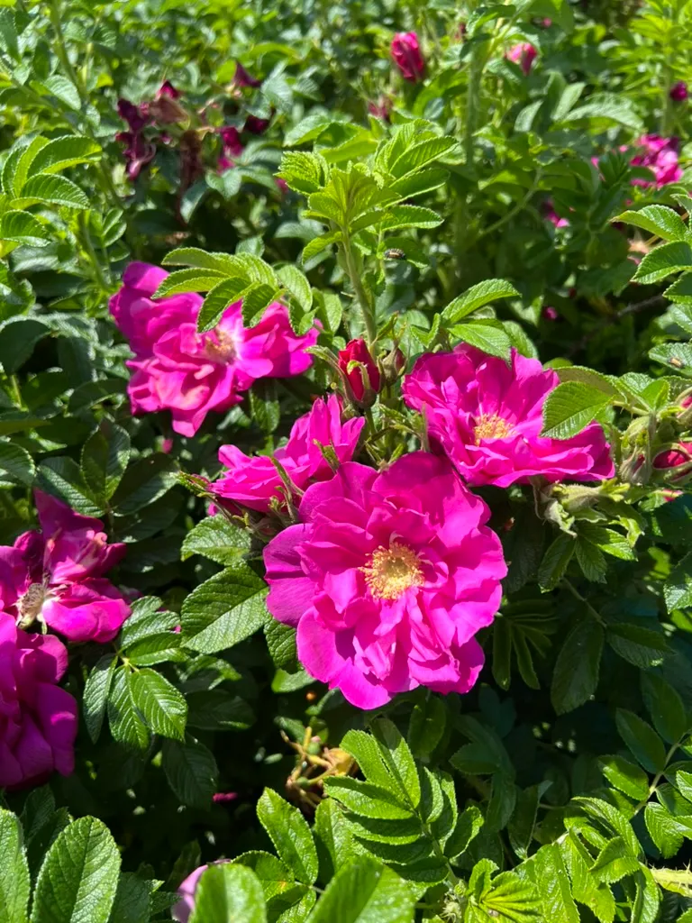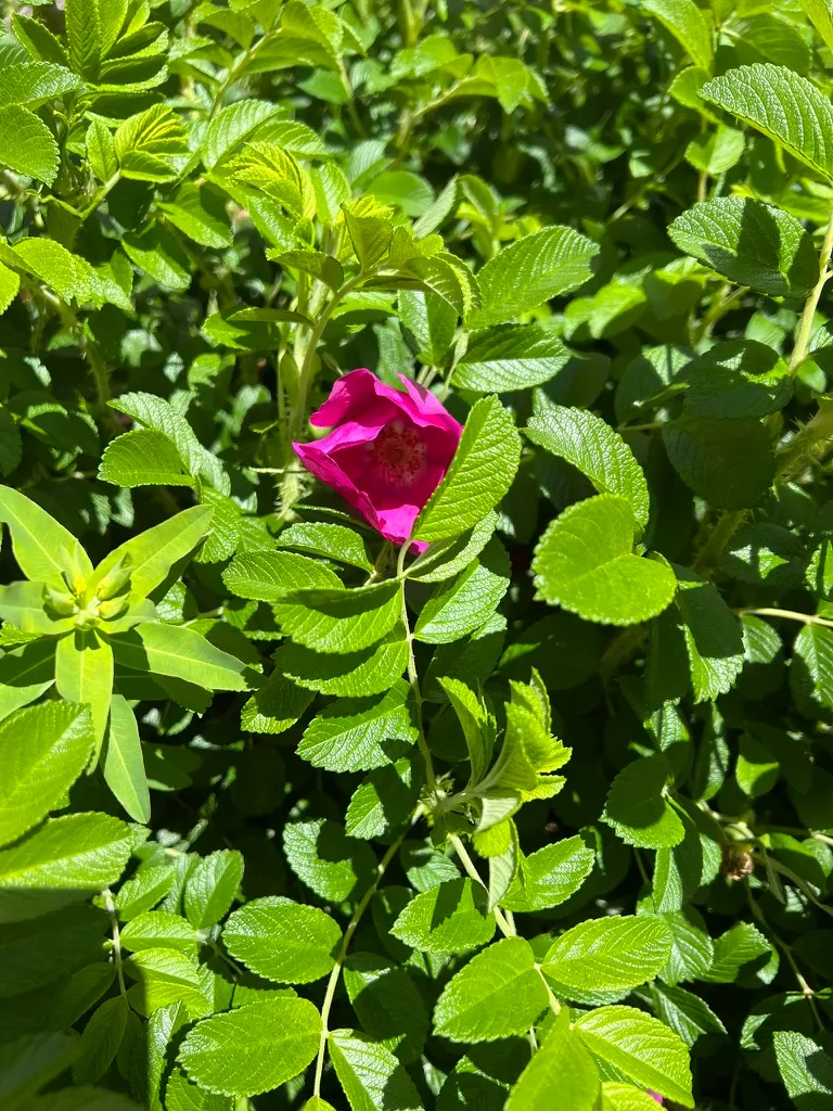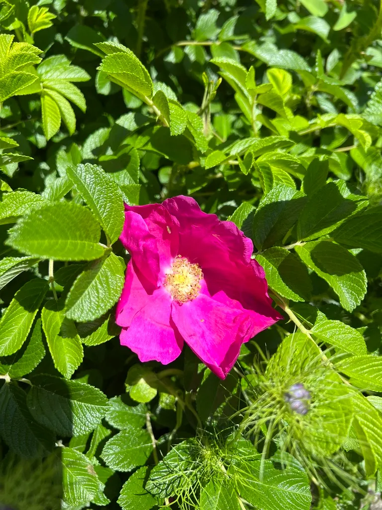 Planted as hedging, barrier planting, coastal erosion control, and wildlife habitat, spaced 3-4 feet (0.9-1.2 m) apart. Exceptionally effective for coastal gardens due to salt spray tolerance. The large, edible hips are valued for making rose hip jam, syrup, and tea (high in vitamin C). Dense prickly thickets provide secure nesting habitat for birds. Check invasive status before planting near coastal ecosystems. The cultivar 'Hansa' (semi-double, magenta, intensely fragrant) and f. alba (single, white) are widely planted.How to Identify