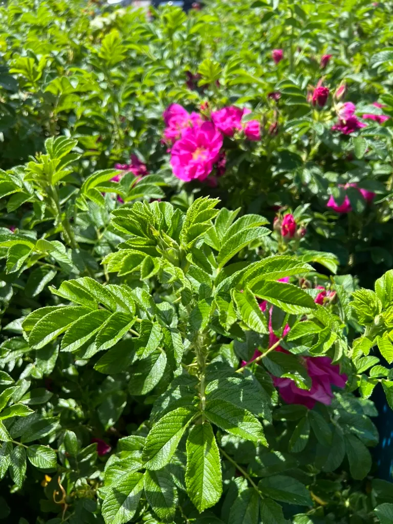Rosa rugosa is a dense, suckering deciduous shrub reaching 4-6 feet (1.2-1.8 m) tall with a spread of 4-6 feet (1.2-1.8 m), forming broad, rounded, impenetrable thickets through root suckers. The species name refers to the rugose (wrinkled, deeply veined) leaves — a distinctive identification feature. Canes are densely covered with straight prickles and bristles of varying sizes, making the plant effectively impenetrable. Leaves are alternate, pinnately compound, with 5-9 leaflets, each 1-2 inches (2.5-5 cm) long, thick, leathery, dark green, and deeply wrinkled (rugose) with sunken veins — unlike the smooth, glossy leaves of most other roses. Fall foliage is yellow to orange. Flowers are single (5 petals) to semi-double, 2.5-3.5 inches (6-9 cm) across, in shades of magenta-pink to purple-pink (white in f. alba), intensely fragrant with a strong, classic rose scent, produced singly or in small clusters. Repeat-blooming from June through September. Hips are large, 1-1.25 inches (2.5-3 cm) across, round, tomato-shaped, bright orange-red, ripening in August to September and persisting into winter. Hips are edible and high in vitamin C. Growth rate is moderate at 12-18 inches (30-46 cm) per year. Tolerates salt spray, sandy soils, and extreme cold (zone 2). Essentially immune to black spot, powdery mildew, and other rose diseases. Classified as invasive in some coastal areas of the Pacific Northwest; check local regulations.
