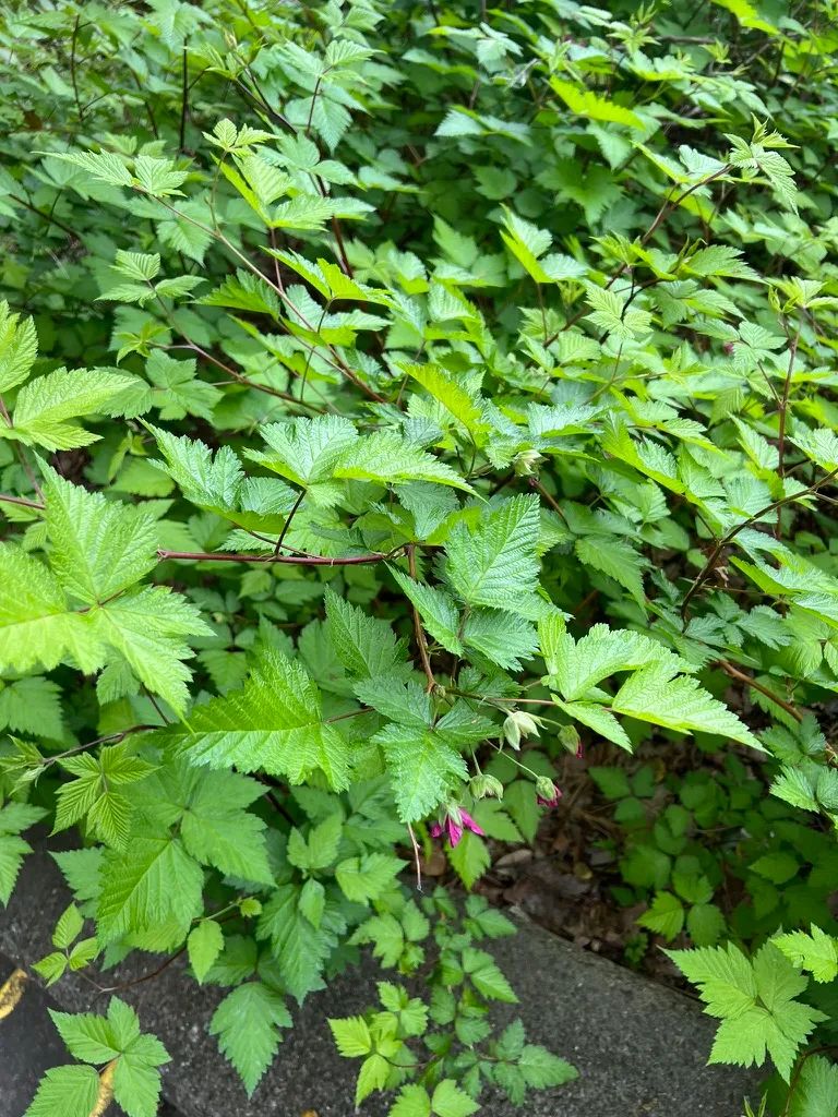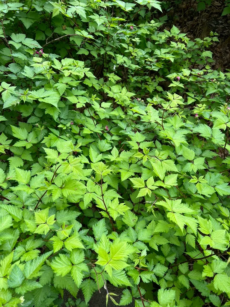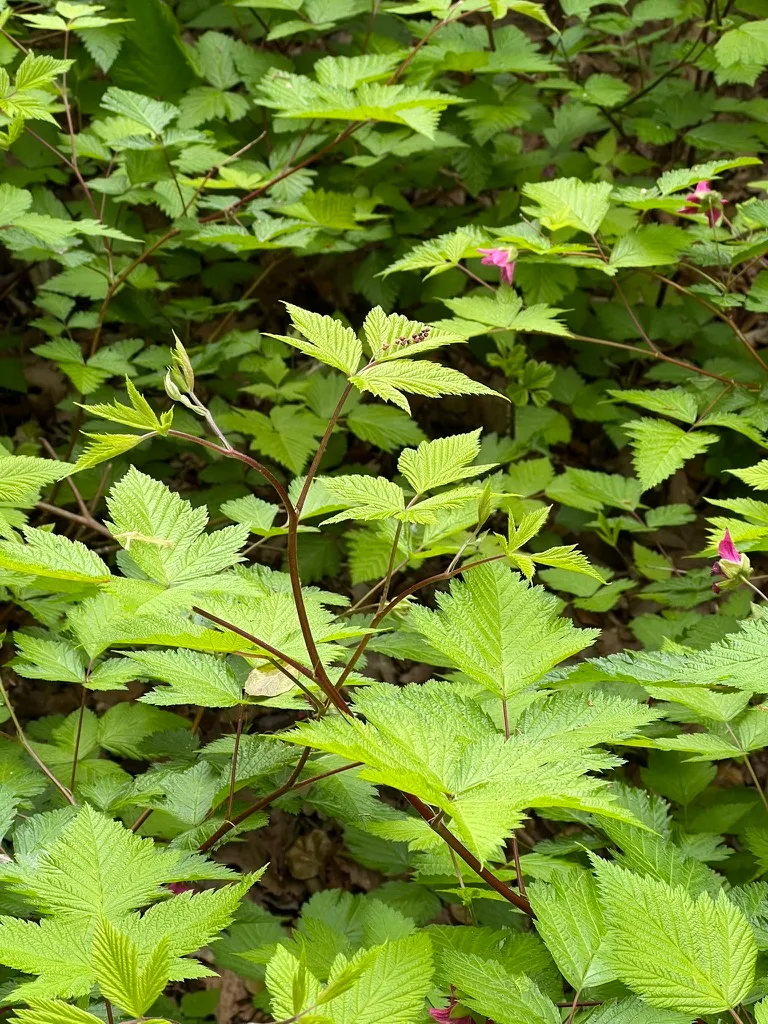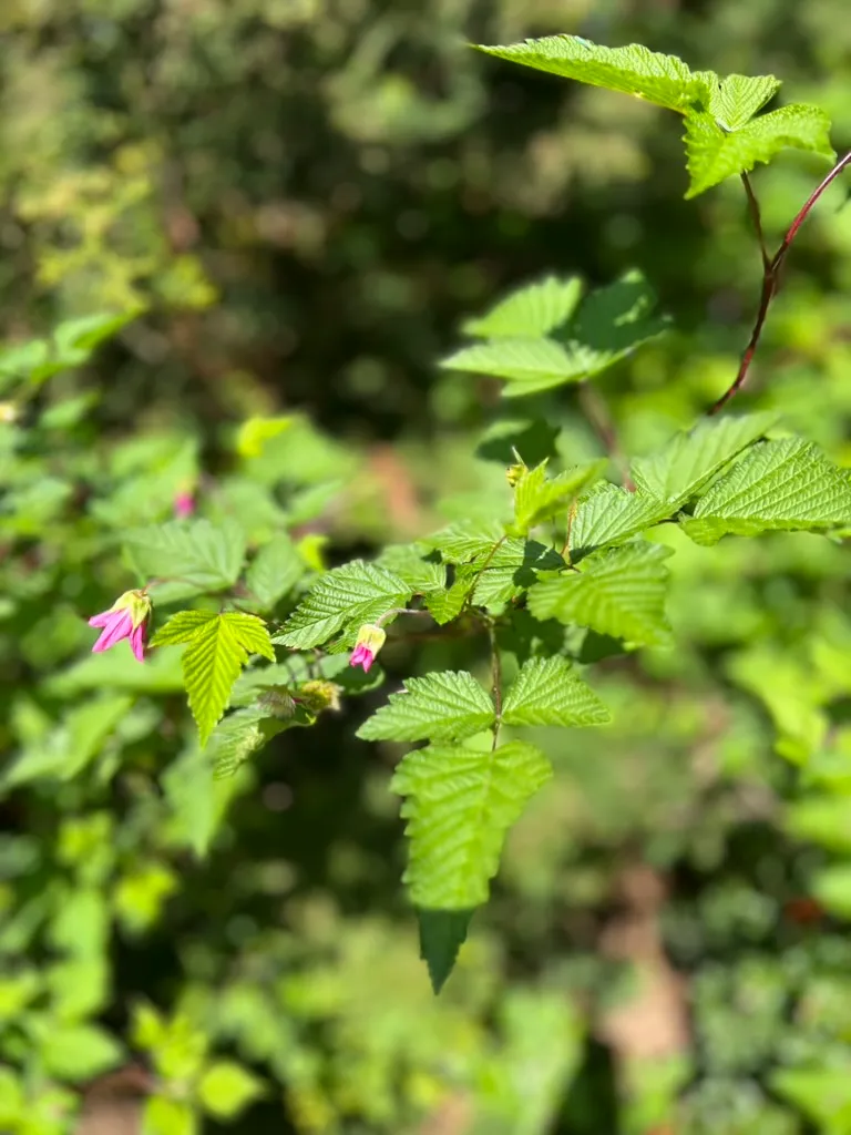medium green; TRIFOLIATE — three ovate doubly-serrated leaflets, terminal leaflet largest; sparse scattered hooked prickles on stems (much less dense than invasive blackberries); DIOECIOUS — male and female on separate plants; spectabilis = 'spectacular'Growing Conditions