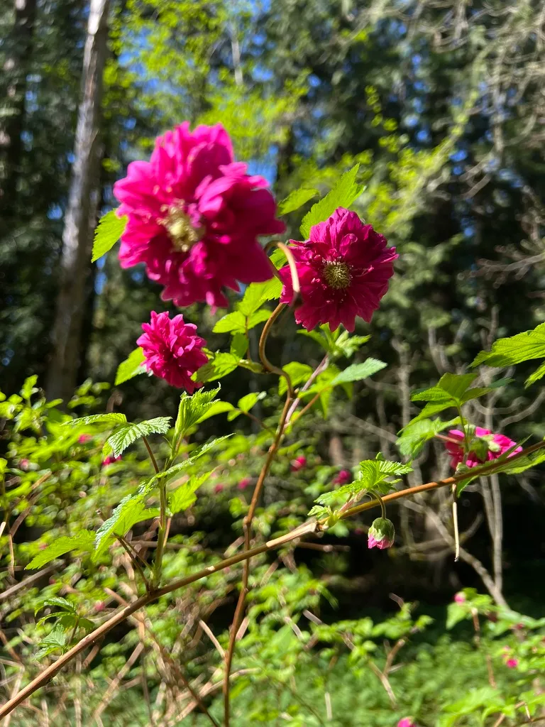 A tall, upright, colony-forming, deciduous shrub in the family Rosaceae, native to moist stream banks, wetland edges, wet forest understories, and coastal forests from Alaska south through British Columbia, Washington, and Oregon to California. The specific epithet spectabilis means 'spectacular,' referring to the vivid magenta-pink flowers that cover the bare branches in late winter and early spring. Plants grow 4–12 feet (1.2–3.7 m) tall from spreading rhizomes, forming dense colonies. The stems bear sparse, scattered, hooked prickles and trifoliate compound leaves with three ovate, doubly serrated leaflets. Rubus spectabilis is dioecious — male and female flowers are on separate plants. From February through May, before or as the leaves emerge, the branches bear large, vivid magenta-pink (occasionally white) five-petaled flowers 1–1.5 inches (2.5–4 cm) across — one of the earliest native PNW shrubs to bloom and a critical early nectar source for Anna's hummingbirds and bumblebee queens. The berries, ripening July–August, are aggregate drupelets resembling raspberries in form but distinctly salmon-colored — ranging from golden-amber to orange-red to deep red. Spreads very aggressively by rhizome. Non-toxic; berries edible and flavorful.