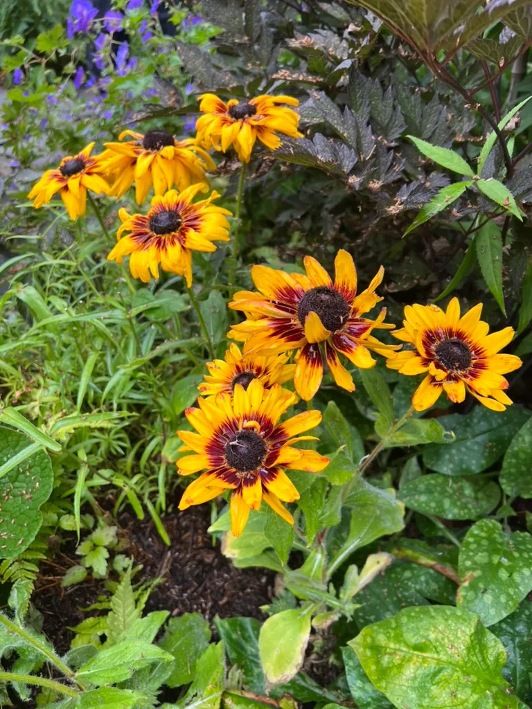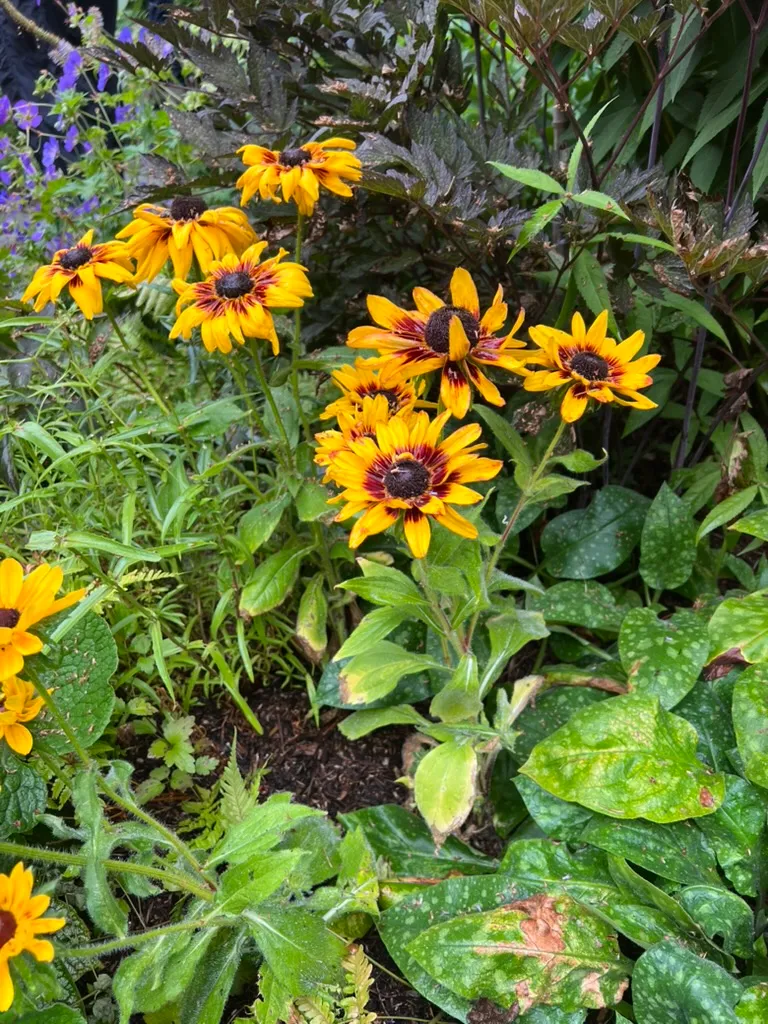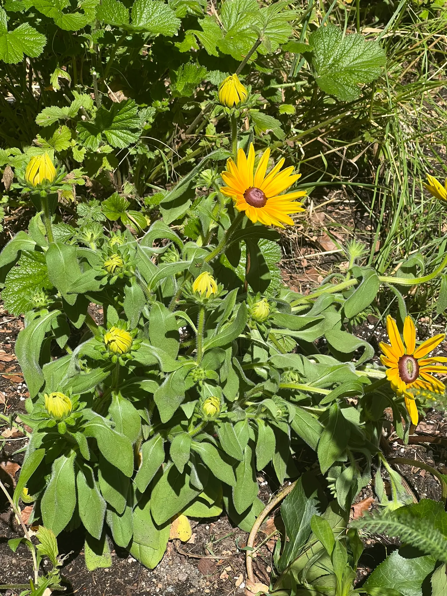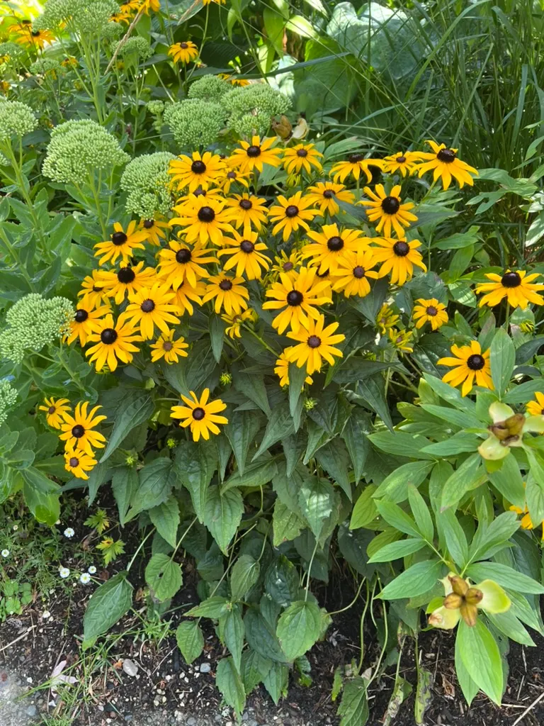 An upright, branching short-lived perennial or biennial in the family Asteraceae, native to open prairies, meadows, roadsides, and disturbed ground throughout most of North America east of the Rocky Mountains. Widely grown as an annual or biennial in cultivation. Plants form a basal rosette of ovate to lance-shaped, coarsely toothed leaves 2–4 inches (5–10 cm) long, densely covered in stiff, rough hairs — the source of the epithet hirta (Latin: hairy). Branching flowering stems 12–36 inches (30–90 cm) tall bear solitary, daisy-like flower heads 2–4 inches (5–10 cm) across on long, hairy peduncles from June through October: 8–20 bright golden-yellow ray florets surround a prominent, dome-shaped brown-purple to nearly black central disc. Modern cultivars include single and double forms in yellow, orange, bronze, mahogany, and bicolors ('Indian Summer', 'Cherry Brandy', 'Cappuccino', 'Toto' dwarf series). Self-seeds freely and naturalizes readily in suitable habitats. Non-toxic.