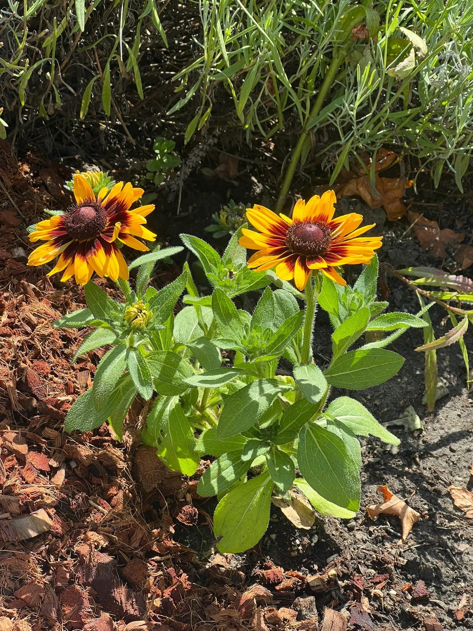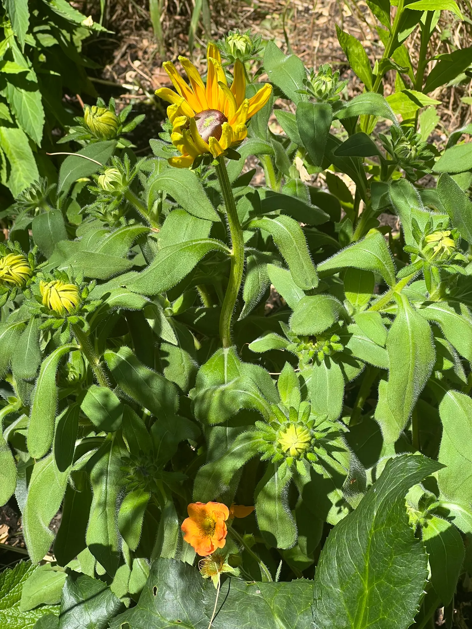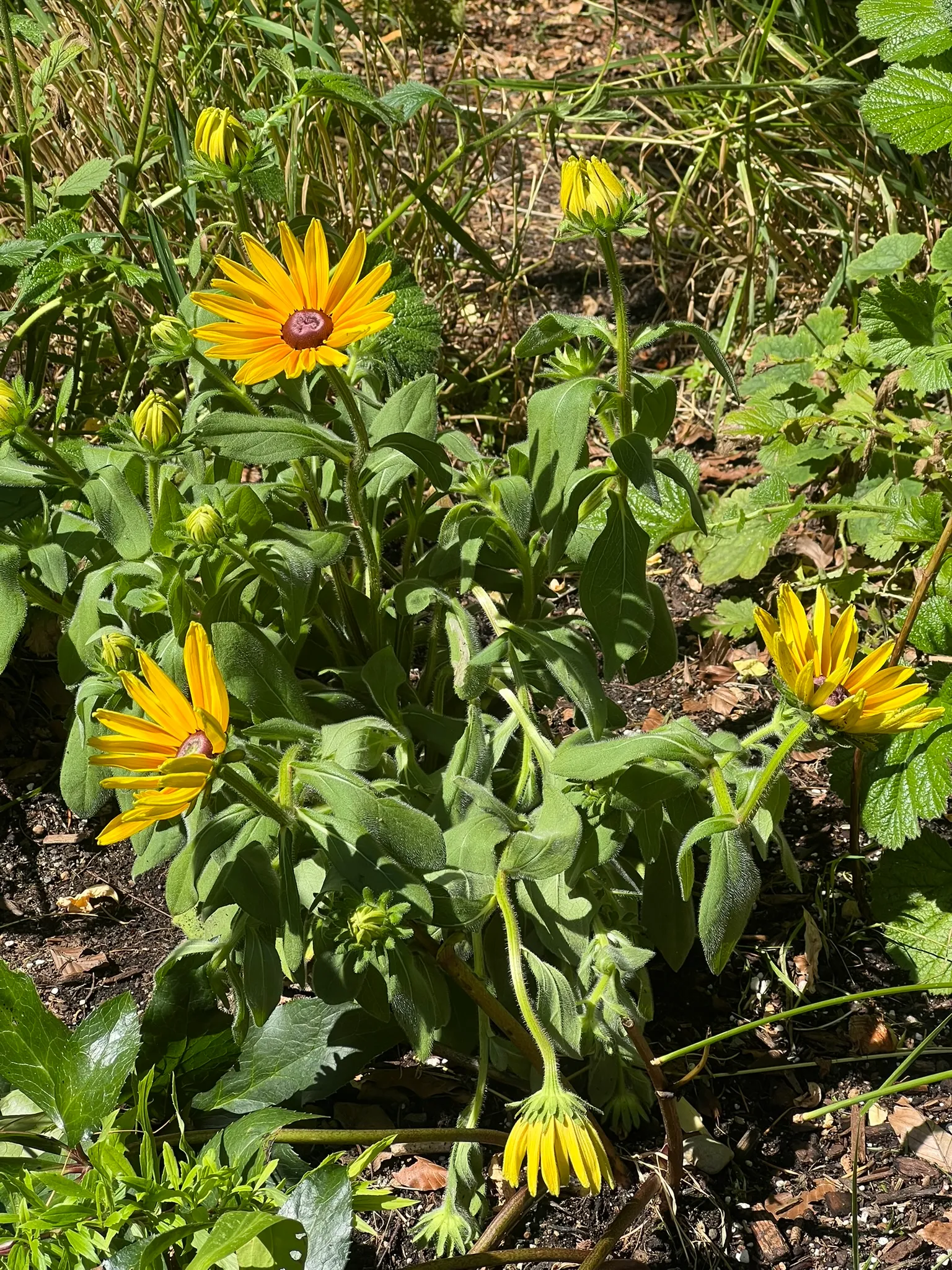 An upright, branching short-lived perennial or biennial in the family Asteraceae, native to open prairies, meadows, roadsides, and disturbed ground throughout most of North America east of the Rocky Mountains. Widely grown as an annual or biennial in cultivation. Plants form a basal rosette of ovate to lance-shaped, coarsely toothed leaves 2–4 inches (5–10 cm) long, densely covered in stiff, rough hairs — the source of the epithet hirta (Latin: hairy). Branching flowering stems 12–36 inches (30–90 cm) tall bear solitary, daisy-like flower heads 2–4 inches (5–10 cm) across on long, hairy peduncles from June through October: 8–20 bright golden-yellow ray florets surround a prominent, dome-shaped brown-purple to nearly black central disc. Modern cultivars include single and double forms in yellow, orange, bronze, mahogany, and bicolors ('Indian Summer', 'Cherry Brandy', 'Cappuccino', 'Toto' dwarf series). Self-seeds freely and naturalizes readily in suitable habitats. Non-toxic.