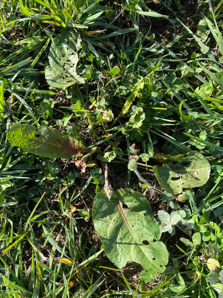 Rumex obtusifolius is a taprooted perennial in the buckwheat family (Polygonaceae) reaching 24–48 inches (60–120 cm) tall with a 12–24 inch (30–60 cm) spread, arising from a stout, fleshy, yellow taproot similar to R. crispus. Stems are erect, stiff, grooved, branching in the upper half. Basal leaves are broadly ovate, 6–14 inches (15–35 cm) long and 3–8 inches (8–20 cm) wide, with a cordate (heart-shaped) base and an obtuse (blunt-rounded) tip — much broader and wider than the lance-shaped leaves of R. crispus. Leaf margins are flat to slightly wavy (not strongly crisped). Stem leaves are smaller, alternate, with papery ocreae at the nodes. Flowers are tiny, greenish, in dense whorls on branching panicles. Fruit is a triangular achene enclosed in 3 enlarged valves, each 0.16–0.24 inch (4–6 mm) long, with prominent teeth (spiny projections) on the margins and usually a single prominent grain — the toothed valve margin is the primary distinction from R. crispus. A single plant produces 20,000–60,000 seeds, viable in soil for 50–80 years. Contains oxalic acid; toxic to livestock in quantity. Hybridizes readily with R. crispus to produce R. x pratensis, which shows intermediate leaf and fruit characters.