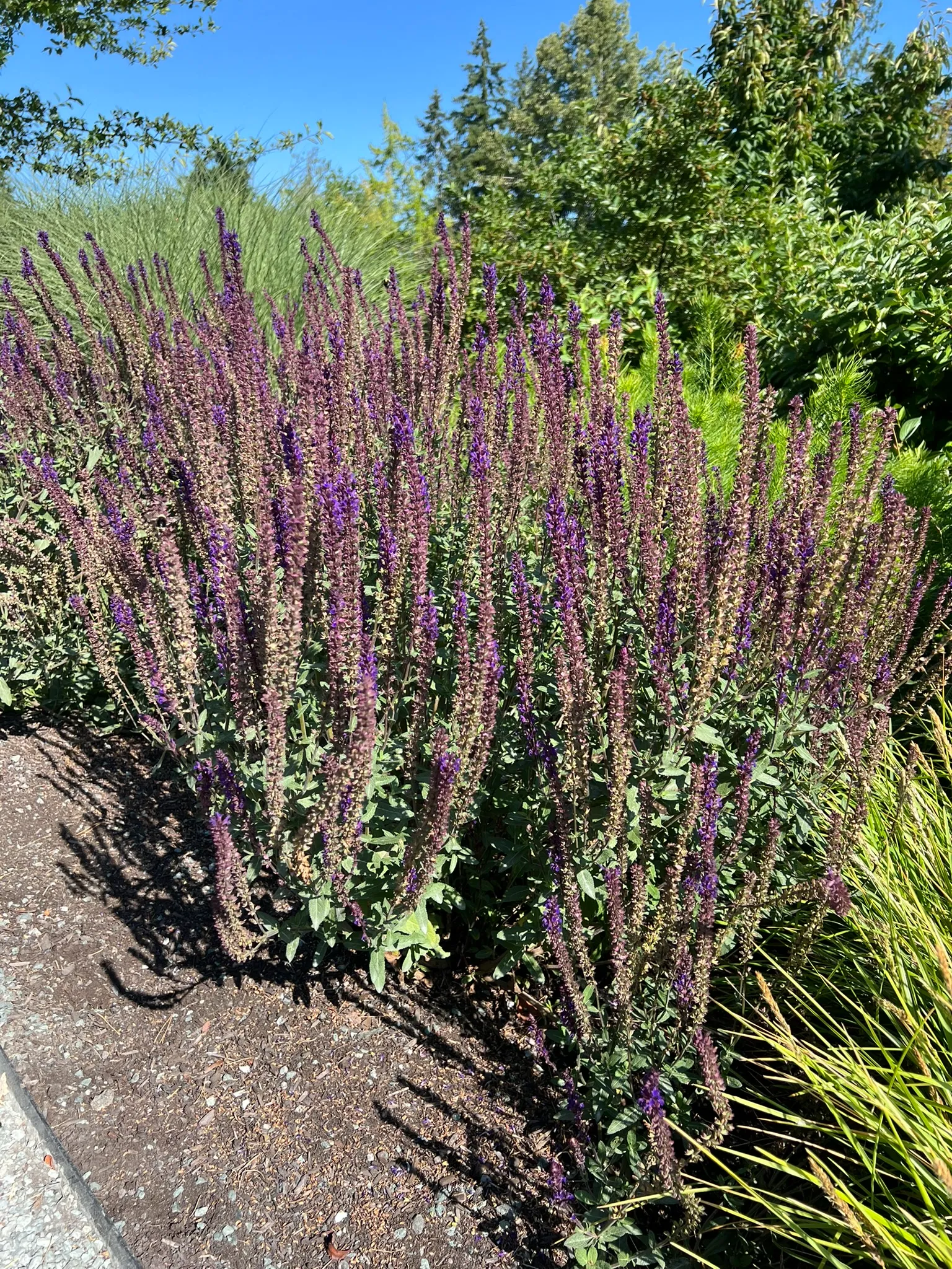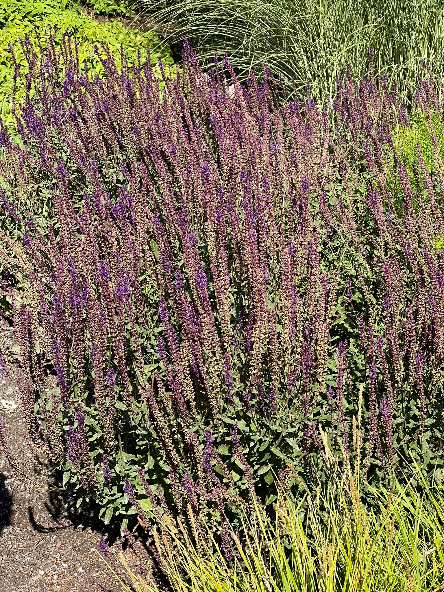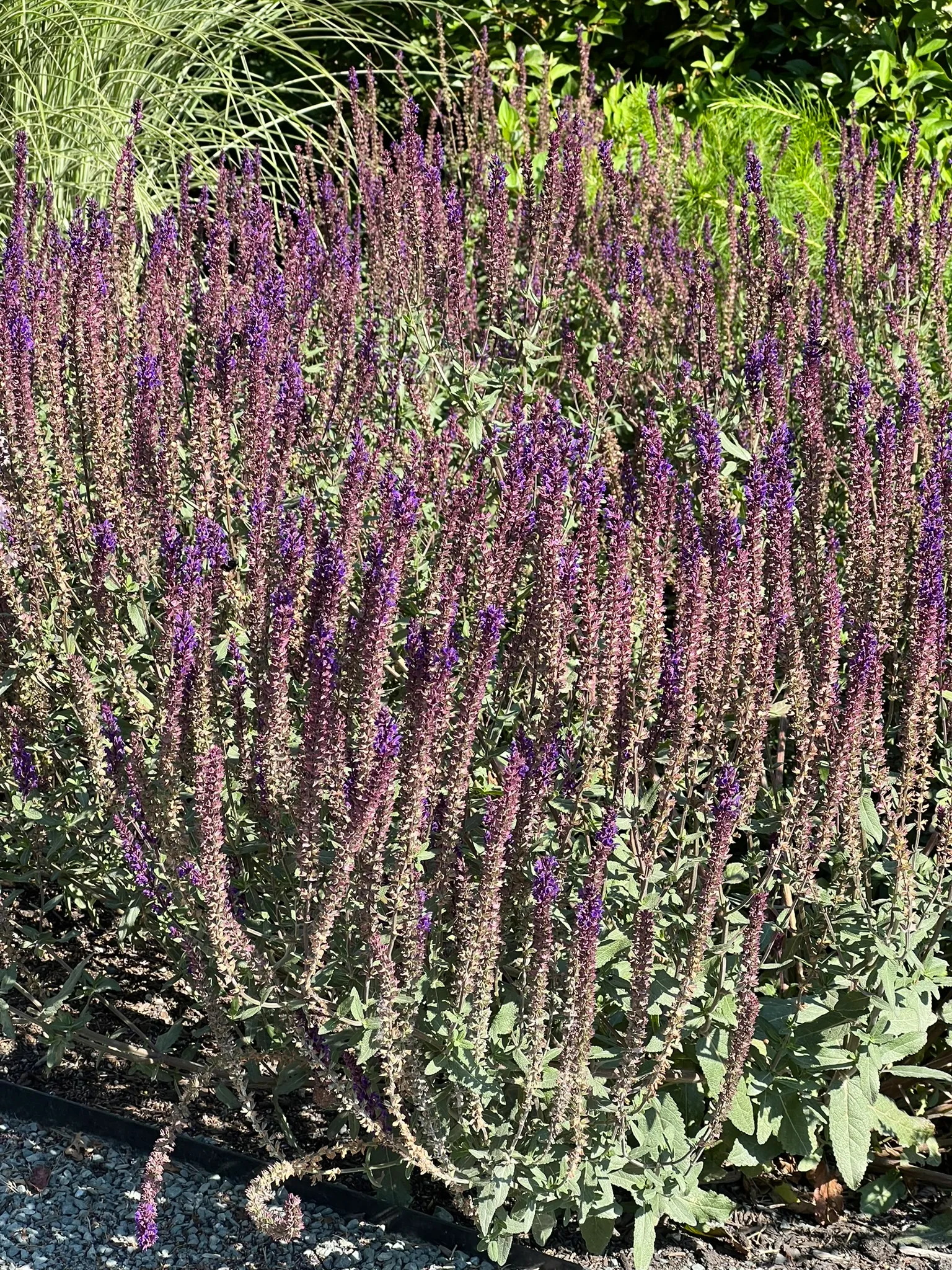 A clump-forming perennial reaching 18–24 inches (45–60 cm) tall and 18–24 inches (45–60 cm) wide. Stems erect, square, branching from the base. Leaves opposite, lance-shaped to ovate, 1.5–3 inches (4–7.5 cm) long, medium green, rugose, with a finely scalloped margin and a slightly aromatic quality when bruised. Flower spikes terminal and axillary, 4–8 inches (10–20 cm) long, densely packed with small two-lipped flowers 0.4–0.6 inch (1–1.5 cm) long in violet-blue to blue-purple with persistent violet-purple bracts that remain ornamental after flowers fade, extending the display by 2–3 weeks. Blooms heavily in late spring to early summer; shearing after the first flush encourages a strong second flush in late summer. Hardy in USDA zones 4–8. One of the most reliable and widely planted perennial sages.