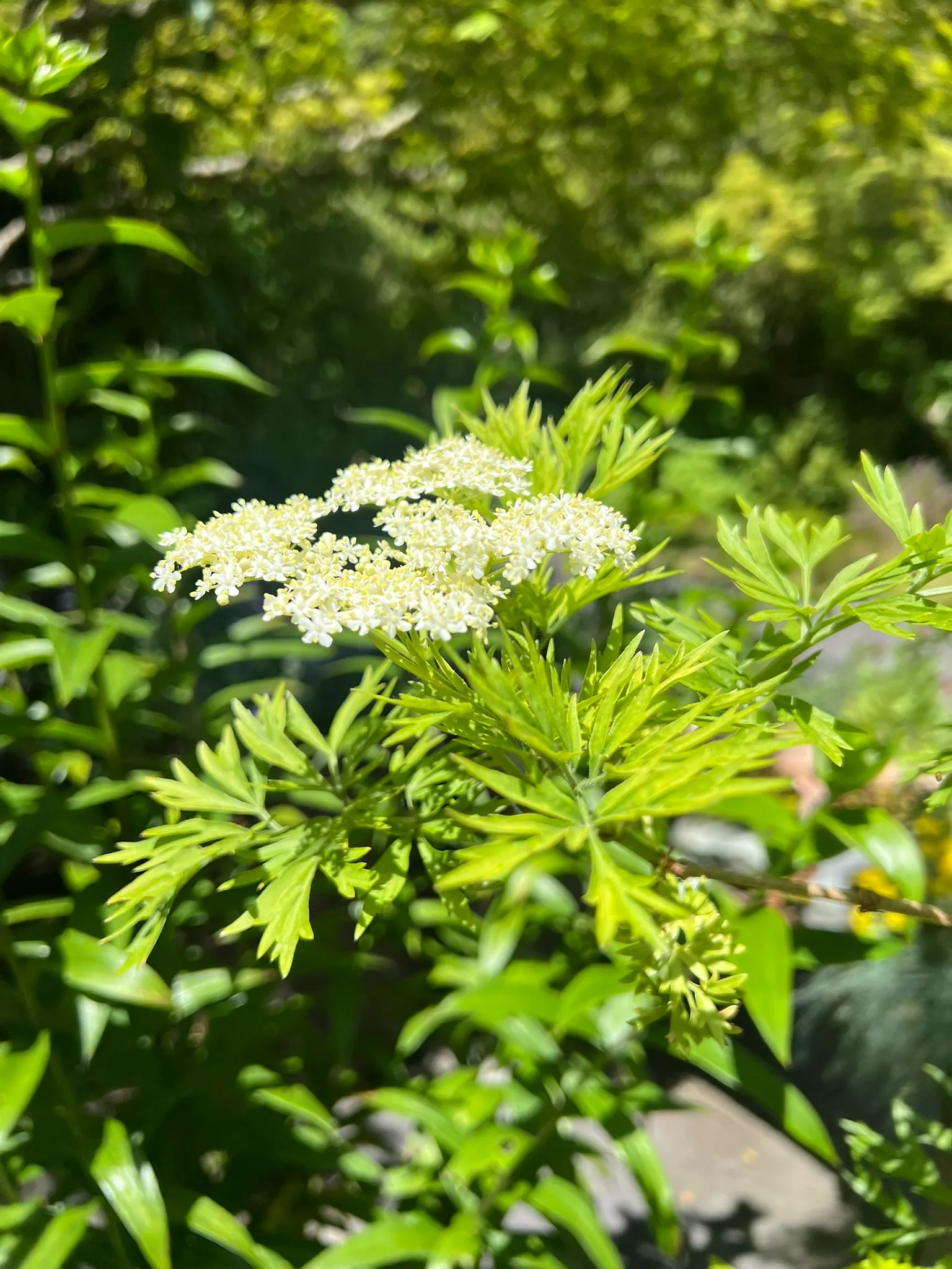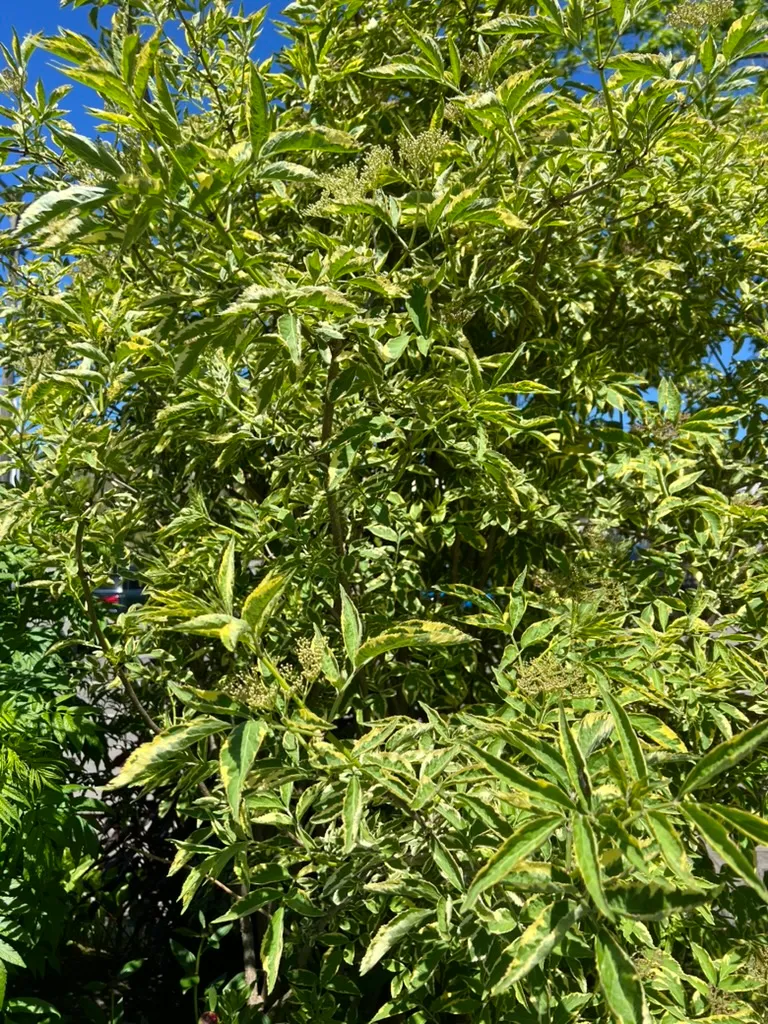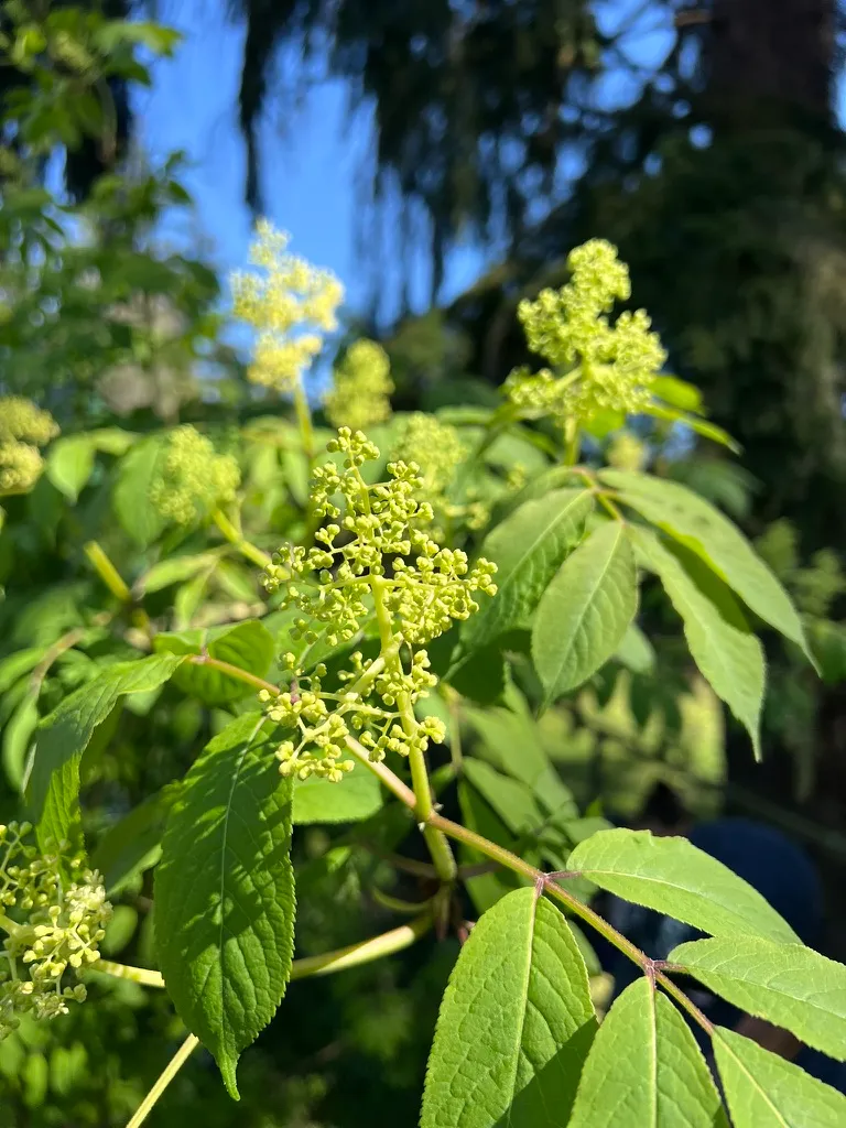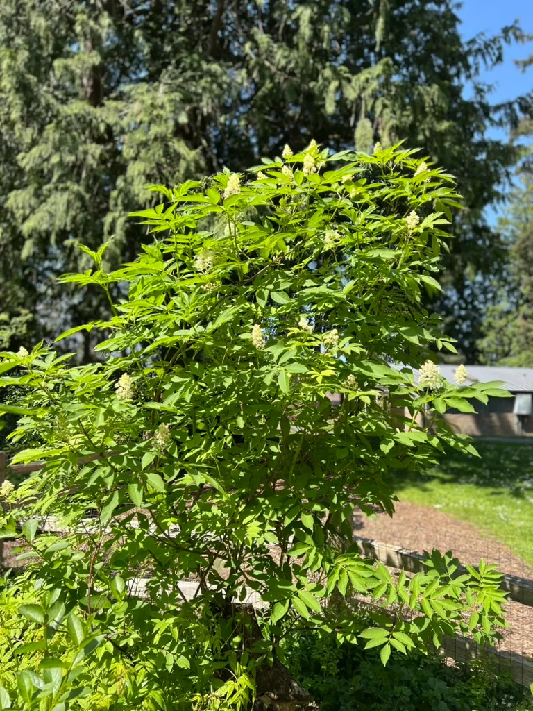 Sambucus species are fast-growing deciduous shrubs or small trees reaching 6-20 feet (1.8-6 m) tall depending on species, with a spread of 6-12 feet (1.8-3.7 m), developing multi-stemmed, upright to arching forms. Stems are soft-wooded with a distinctive white pith when cut. Leaves are opposite, pinnately compound, with 5-11 leaflets, each 2-5 inches (5-13 cm) long, sharply serrate. Flowers are small, creamy-white to white, borne in large, flat-topped to dome-shaped terminal cymes (corymbs), 6-10 inches (15-25 cm) across, in June to July, with a distinctive musky-sweet fragrance. Berries are small, 0.2-0.3 inch (5-8 mm), in heavy drooping clusters, ripening in August to September: blue-black in S. nigra and S. cerulea, red in S. racemosa. Key species in the Pacific Northwest include: S. nigra (European elderberry) — the primary commercial and ornamental species with numerous cultivars; S. cerulea (blue elderberry) — native to western North America; and S. racemosa (red elderberry) — native to the Pacific Northwest, with red berries that are toxic raw but edible when cooked. Growth rate is very fast at 24-36 inches (61-91 cm) per year. Ornamental cultivars include 'Black Lace' (finely dissected purple-black foliage, pink flowers), 'Black Beauty' (purple foliage, pink flowers), and 'Aurea' (golden foliage). Raw berries of most species contain cyanogenic glycosides and should be cooked before consumption; S. racemosa berries require cooking. All green parts (leaves, stems, roots, unripe berries) are toxic.