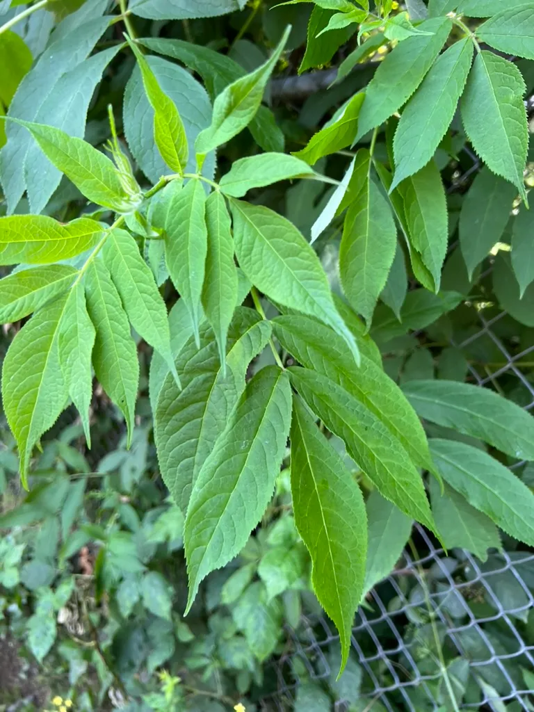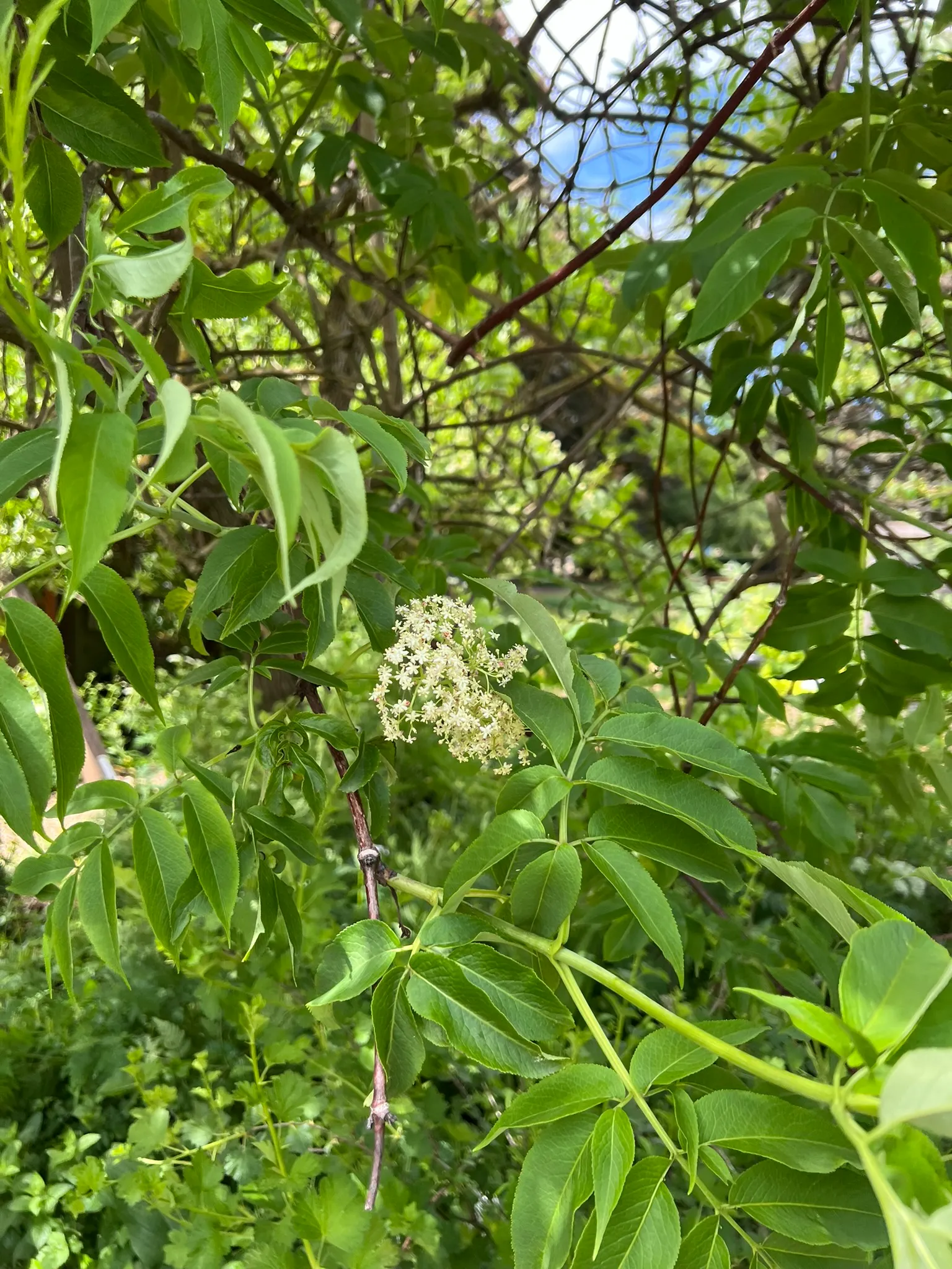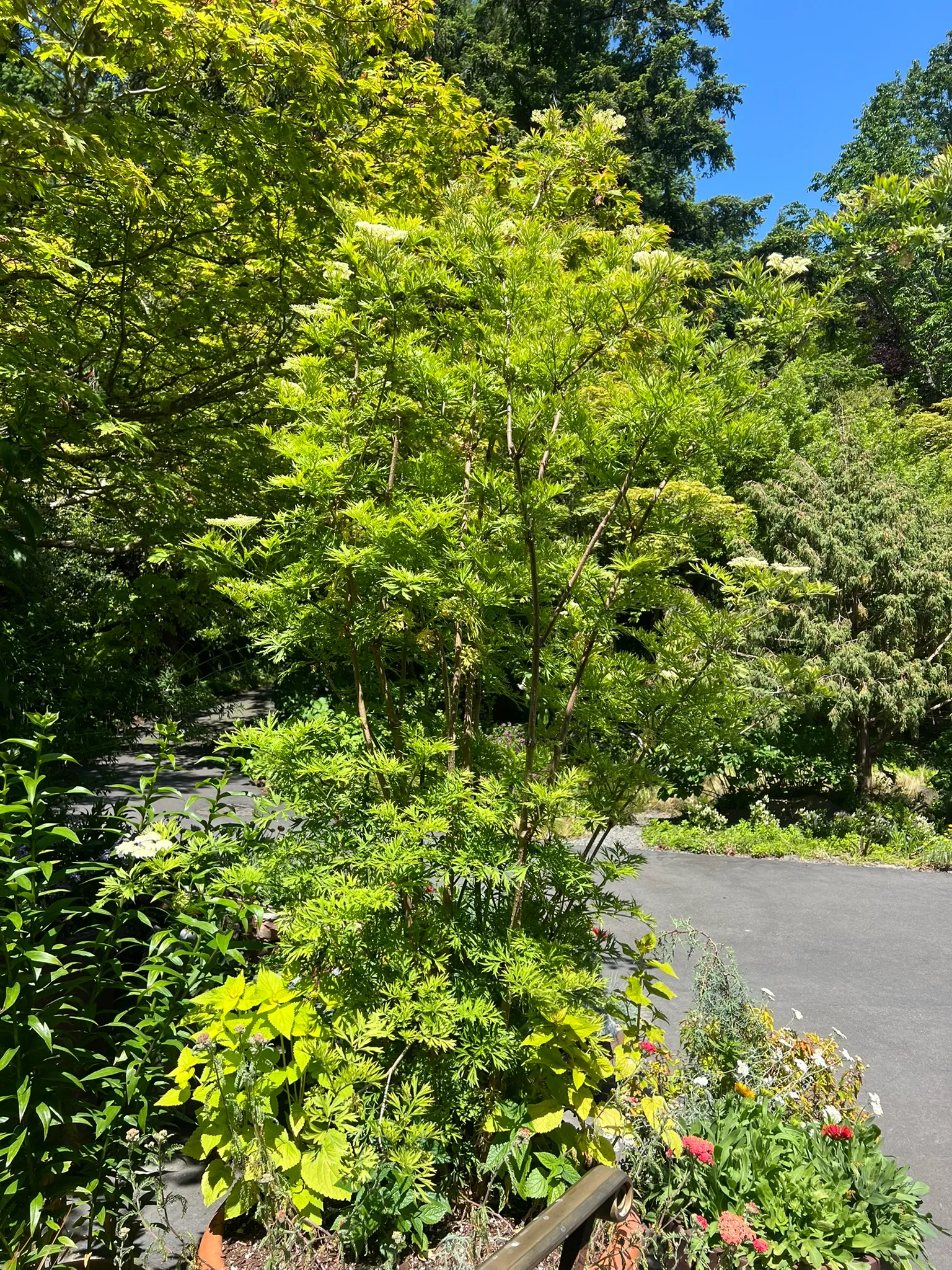 Sambucus species are fast-growing deciduous shrubs or small trees reaching 6-20 feet (1.8-6 m) tall depending on species, with a spread of 6-12 feet (1.8-3.7 m), developing multi-stemmed, upright to arching forms. Stems are soft-wooded with a distinctive white pith when cut. Leaves are opposite, pinnately compound, with 5-11 leaflets, each 2-5 inches (5-13 cm) long, sharply serrate. Flowers are small, creamy-white to white, borne in large, flat-topped to dome-shaped terminal cymes (corymbs), 6-10 inches (15-25 cm) across, in June to July, with a distinctive musky-sweet fragrance. Berries are small, 0.2-0.3 inch (5-8 mm), in heavy drooping clusters, ripening in August to September: blue-black in S. nigra and S. cerulea, red in S. racemosa. Key species in the Pacific Northwest include: S. nigra (European elderberry) — the primary commercial and ornamental species with numerous cultivars; S. cerulea (blue elderberry) — native to western North America; and S. racemosa (red elderberry) — native to the Pacific Northwest, with red berries that are toxic raw but edible when cooked. Growth rate is very fast at 24-36 inches (61-91 cm) per year. Ornamental cultivars include 'Black Lace' (finely dissected purple-black foliage, pink flowers), 'Black Beauty' (purple foliage, pink flowers), and 'Aurea' (golden foliage). Raw berries of most species contain cyanogenic glycosides and should be cooked before consumption; S. racemosa berries require cooking. All green parts (leaves, stems, roots, unripe berries) are toxic.
