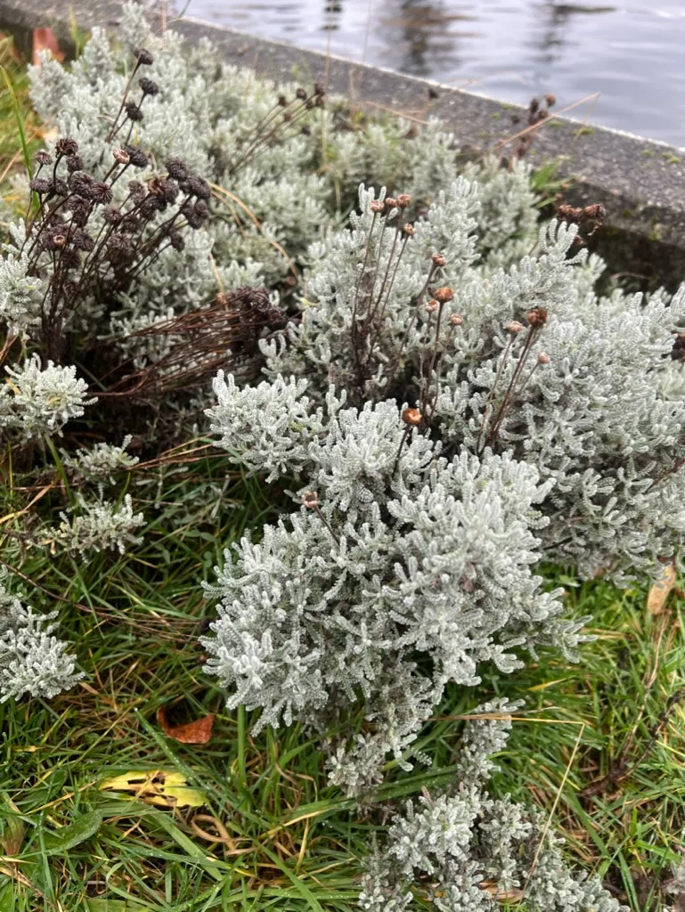 A compact, mound-forming evergreen subshrub reaching 18-24 inches (45-60 cm) tall and 24-36 inches (60-90 cm) wide. Stems are woody at the base, becoming herbaceous toward the tips. Leaves are pinnately divided into tiny, tightly packed segments, 0.5-1.5 inches (1.3-4 cm) long, densely covered in white-woolly pubescence that gives the entire plant a silver-gray appearance. Foliage is aromatic when bruised, with a sharp, camphoraceous scent. Button-like flower heads, 0.5-0.75 inch (1.3-2 cm) in diameter, are bright yellow and borne singly on unbranched peduncles 4-6 inches (10-15 cm) above the foliage from June through July. Growth rate is moderate; plants reach near-mature size within 2 years. The mounded form becomes open and woody at the base after 4-6 years without regular pruning. Plants are short-lived in humid climates with heavy soils, typically declining within 3-5 years under those conditions. In well-drained sites with low humidity, plants persist 8-10 years. Foliage may become leggy and lose its compact form in partial shade. Root rot in wet winter soils is the primary cause of decline in Pacific Northwest gardens west of the Cascades.