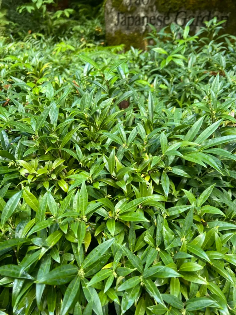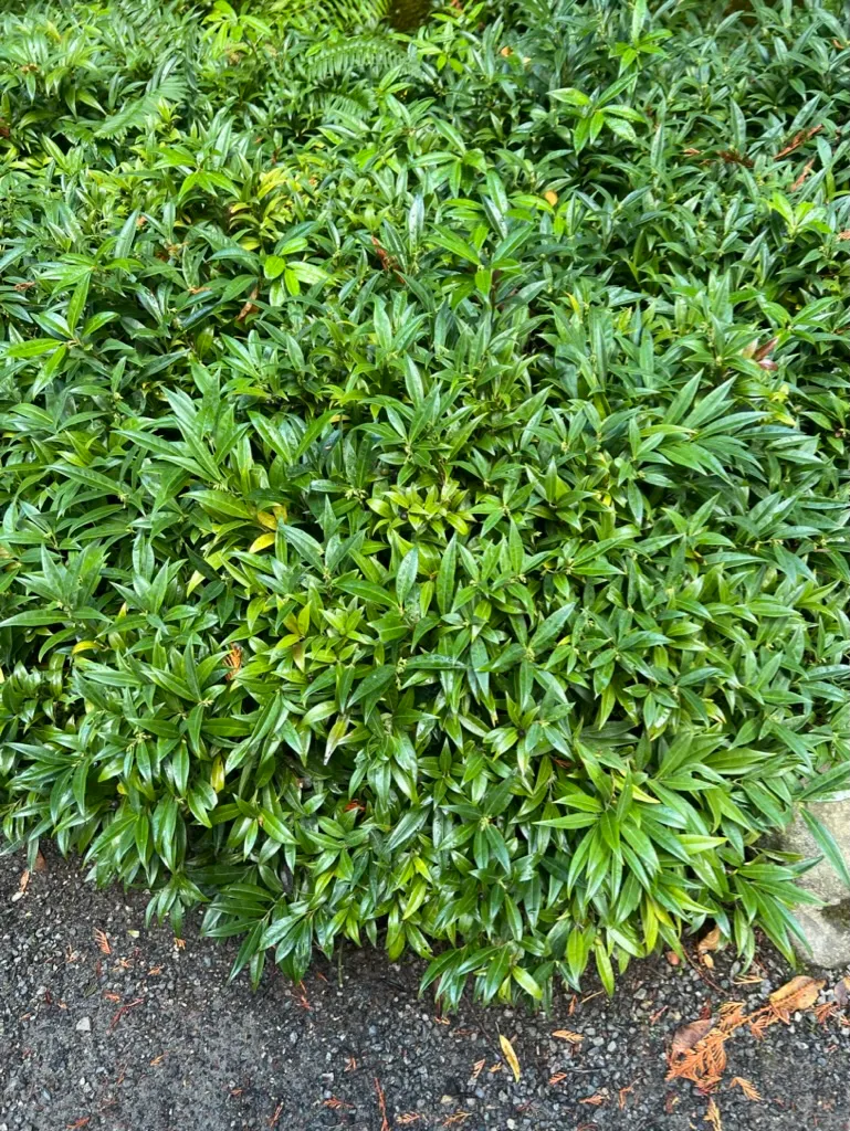 A low-growing, suckering evergreen shrub reaching 12-24 inches (30-60 cm) tall and spreading 24-48 inches (60-120 cm) wide by underground stolons. Stems are green, slender, and upright to slightly arching. Leaves are alternate, narrowly elliptic to lance-shaped, 1-3 inches (2.5-8 cm) long and 0.3-0.6 inch (0.8-1.5 cm) wide, glossy dark green, with a leathery texture and tapering to a point. Flowers are small, 0.2 inch (5 mm), white to pinkish, lacking petals, and borne in clusters in the leaf axils from January through March. Fragrance is intense and sweet with vanilla undertones, detectable from 10-15 feet (3-4.5 m) in still air. Fruit is a glossy, spherical drupe, 0.25 inch (6 mm) in diameter, ripening from red to glossy black and persisting from late spring into summer. Growth rate is slow; plants reach 18 inches (45 cm) within 3-4 years and spread to form a 2-3 foot (60-90 cm) colony within 5-6 years via stoloniferous roots. The suckering habit is more pronounced than in S. confusa, and colonies can gradually expand beyond intended boundaries. Foliage remains glossy and unblemished year-round in zones 6-9. In zone 5, leaf tip burn occurs when temperatures drop below -10°F (-23°C), though plants typically regenerate from the roots.