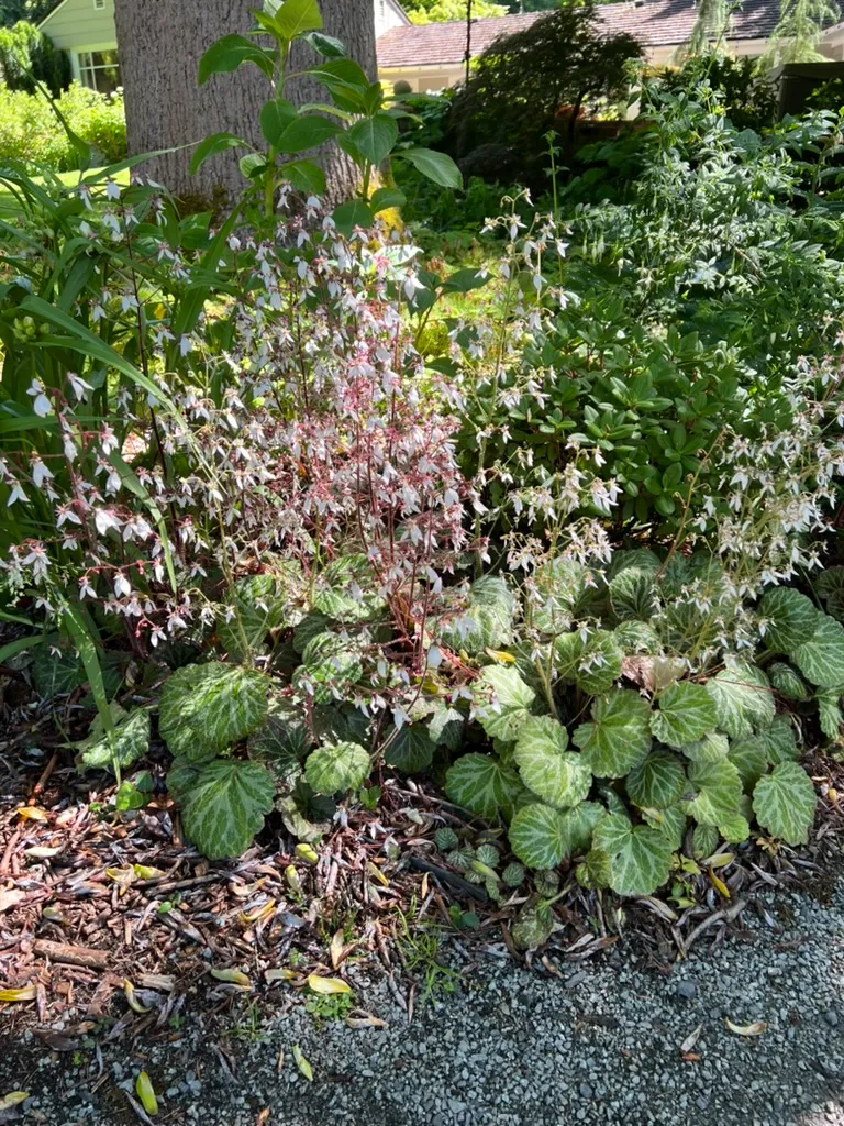 Strawberry begonia is a versatile and visually striking plant for Pacific Northwest shade gardens, valued for its year-round silver-veined foliage, red stolons, and airy spring flowers. Effective as a groundcover beneath trees and shrubs, at the shaded border front, or planted at the edge of a wall or raised bed where the red stolons and plantlets can cascade. Exceptional in hanging baskets and containers as both an indoor and outdoor subject. Combines attractively with Heuchera, Epimedium, Hakonechloa, and shade-tolerant ferns. The golden-variegated cultivar 'Tricolor' (with cream and pink leaf margins) is particularly ornamental and widely available.How to Identify
