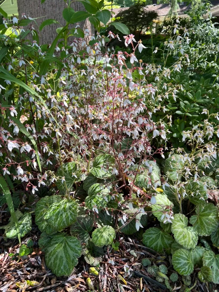 Saxifraga stolonifera, commonly called strawberry begonia or strawberry geranium, is a mat-forming evergreen perennial in the family Saxifragaceae, native to moist, shaded cliff faces, rock outcrops, stream banks, and forest floors across China, Japan, and Korea. Despite both its common names, it is neither a begonia nor a geranium, but a true saxifrage. The plant spreads by long, slender, thread-like red stolons that arch outward and root to produce small plantlets — a habit that strongly resembles the runners of a strawberry plant and gives rise to the common name. Each rosette produces rounded to kidney-shaped leaves 1–4 inches (2.5–10 cm) across, with a distinctive pattern of silvery-gray veins on a dark olive-green to gray-green surface and rich burgundy-red undersides. In late spring to early summer, airy, branching panicles 8–18 inches (20–45 cm) tall carry asymmetrical white flowers — five petals, with two dramatically elongated lower petals 0.5–0.75 inch (1.2–2 cm) and three small upper petals spotted with yellow and red. A remarkably versatile plant in Pacific Northwest gardens — groundcover, container, hanging basket, and houseplant — and notably cold-hardy for what is often treated as a tender subject.