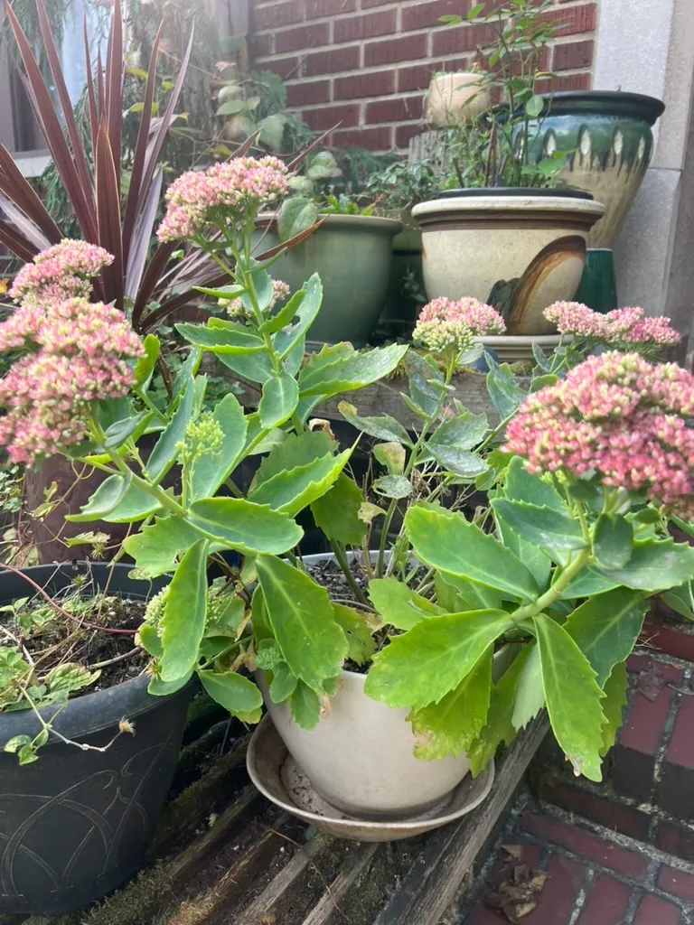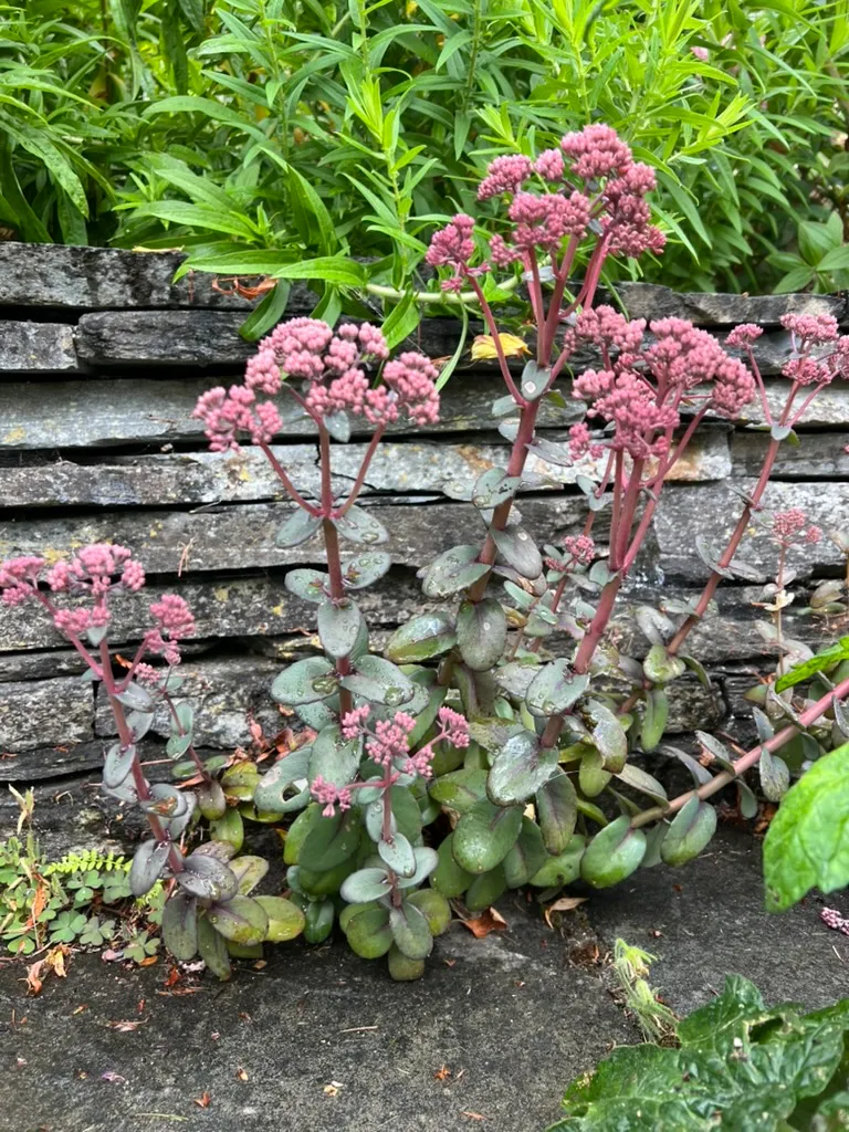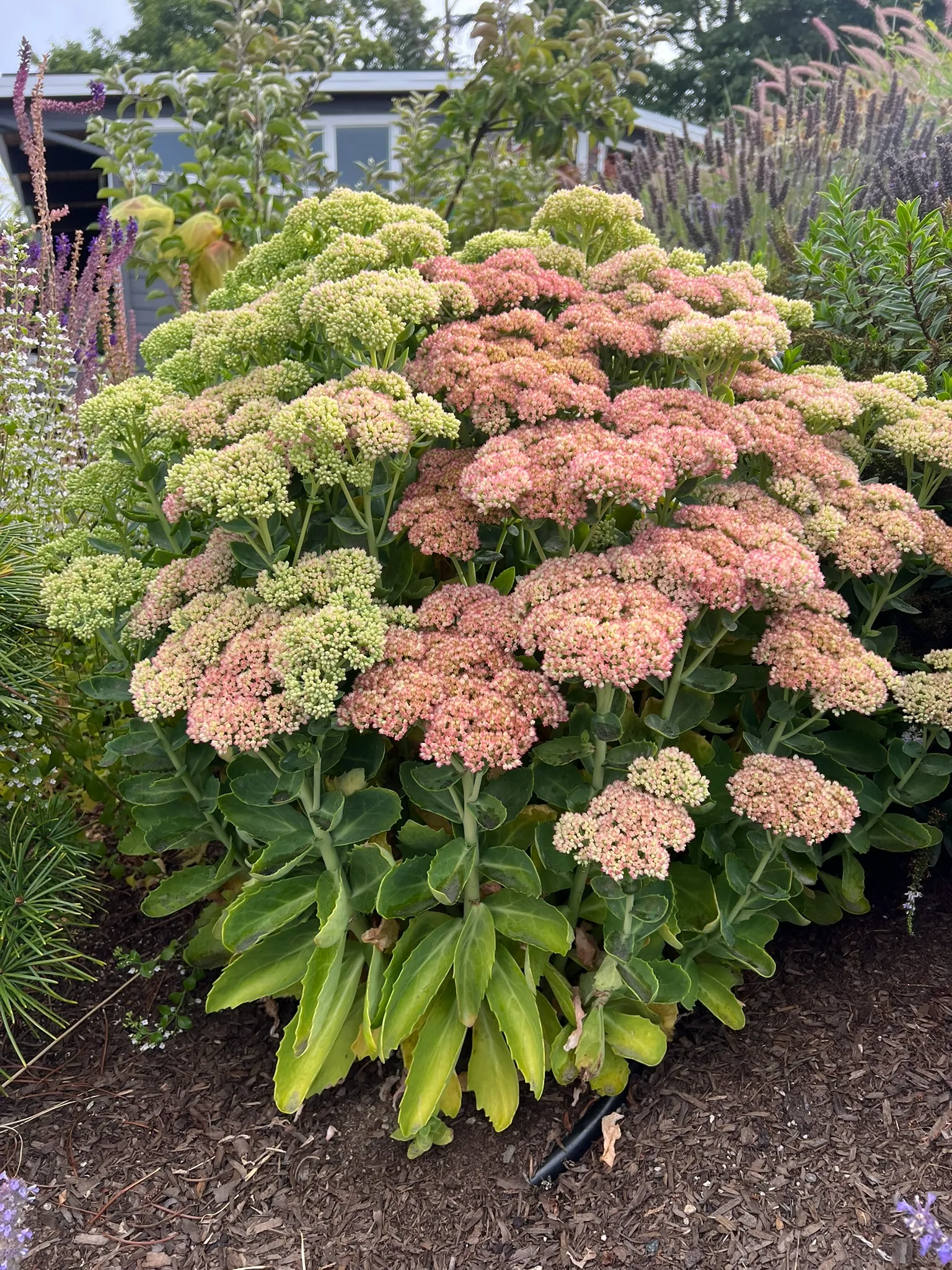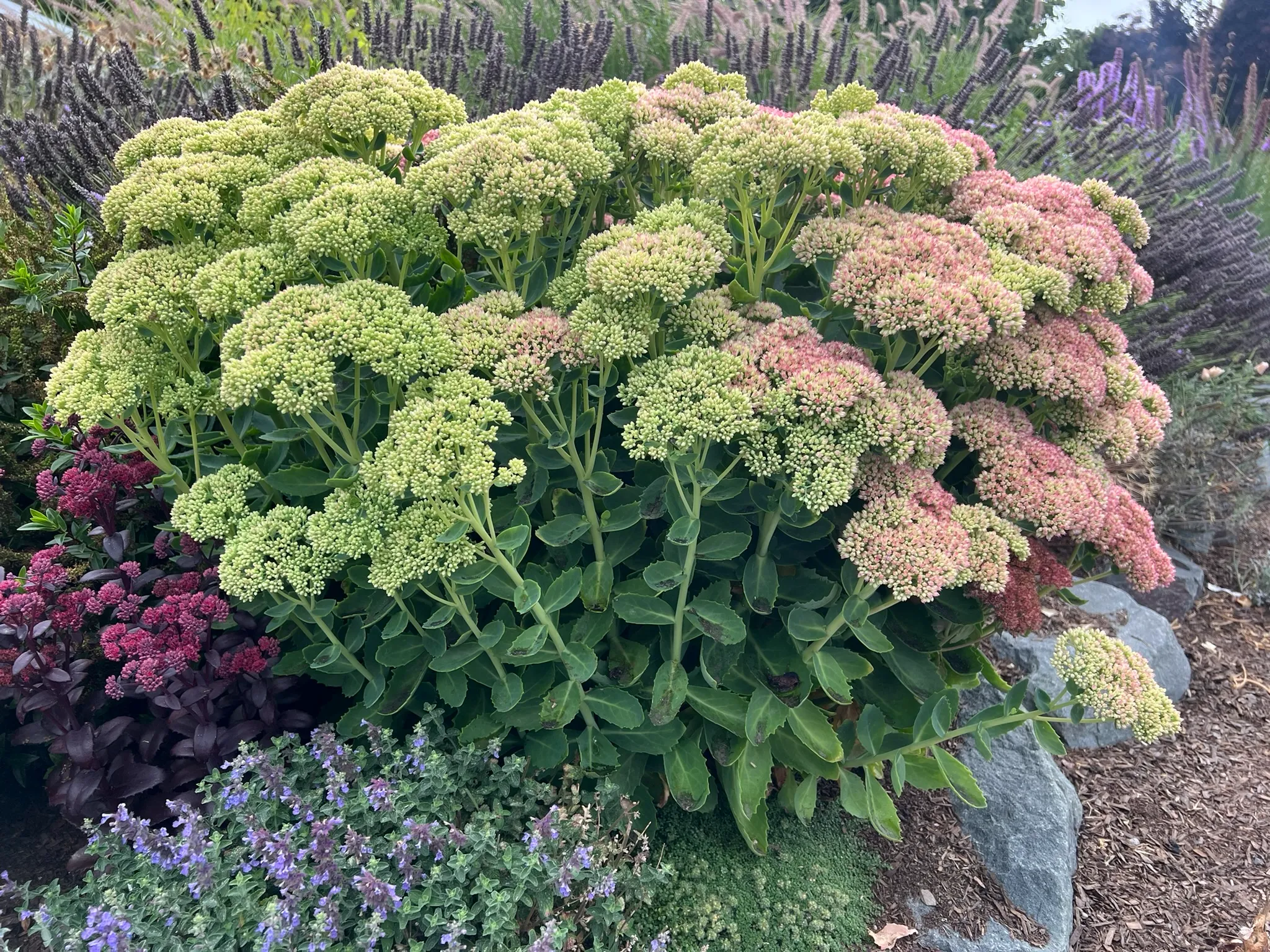 A robust, clump-forming succulent perennial in the family Crassulaceae, native to rocky slopes, hillsides, and open ground of northeastern China (Liaoning, Jilin provinces) and Korea. Currently recognized by many authorities as Hylotelephium spectabile (Boreau) H.Ohba, though the name Sedum spectabile remains widely used in horticulture. Plants form substantial clumps 18–24 inches (45–60 cm) tall and wide of thick, erect, unbranched stems clothed in whorled or opposite, broadly ovate, glaucous, blue-green to gray-green, fleshy leaves 2–3 inches (5–8 cm) long with scalloped margins. From August through September, the stems are topped with large, flat-topped cymes 4–6 inches (10–15 cm) across of masses of tiny, star-shaped, 5-petaled flowers in pink to rose-pink, opening from ornamental bud clusters. The flower heads are among the most intensely butterfly-attractive of any garden perennial. After bloom, faded seed heads turn from buff to russet-brown and persist through winter. Common cultivars include 'Brilliant' (deep rosy-pink), 'Iceberg' (white), and 'Carmen' (deep pink). Hardy to zone 3. Non-toxic.