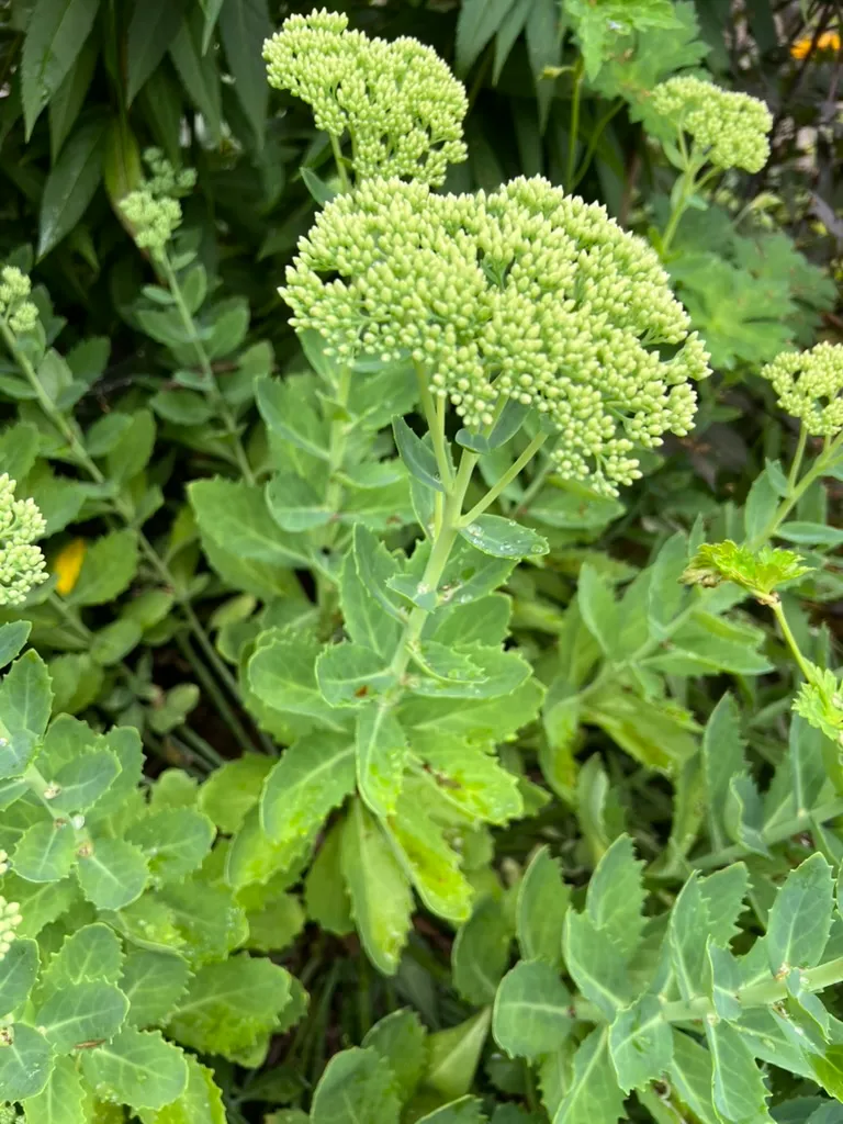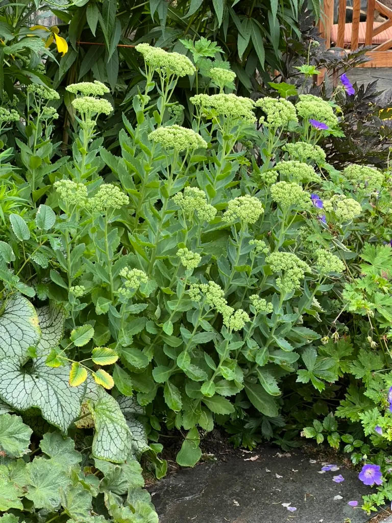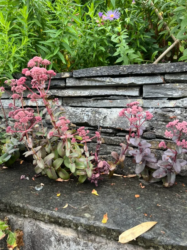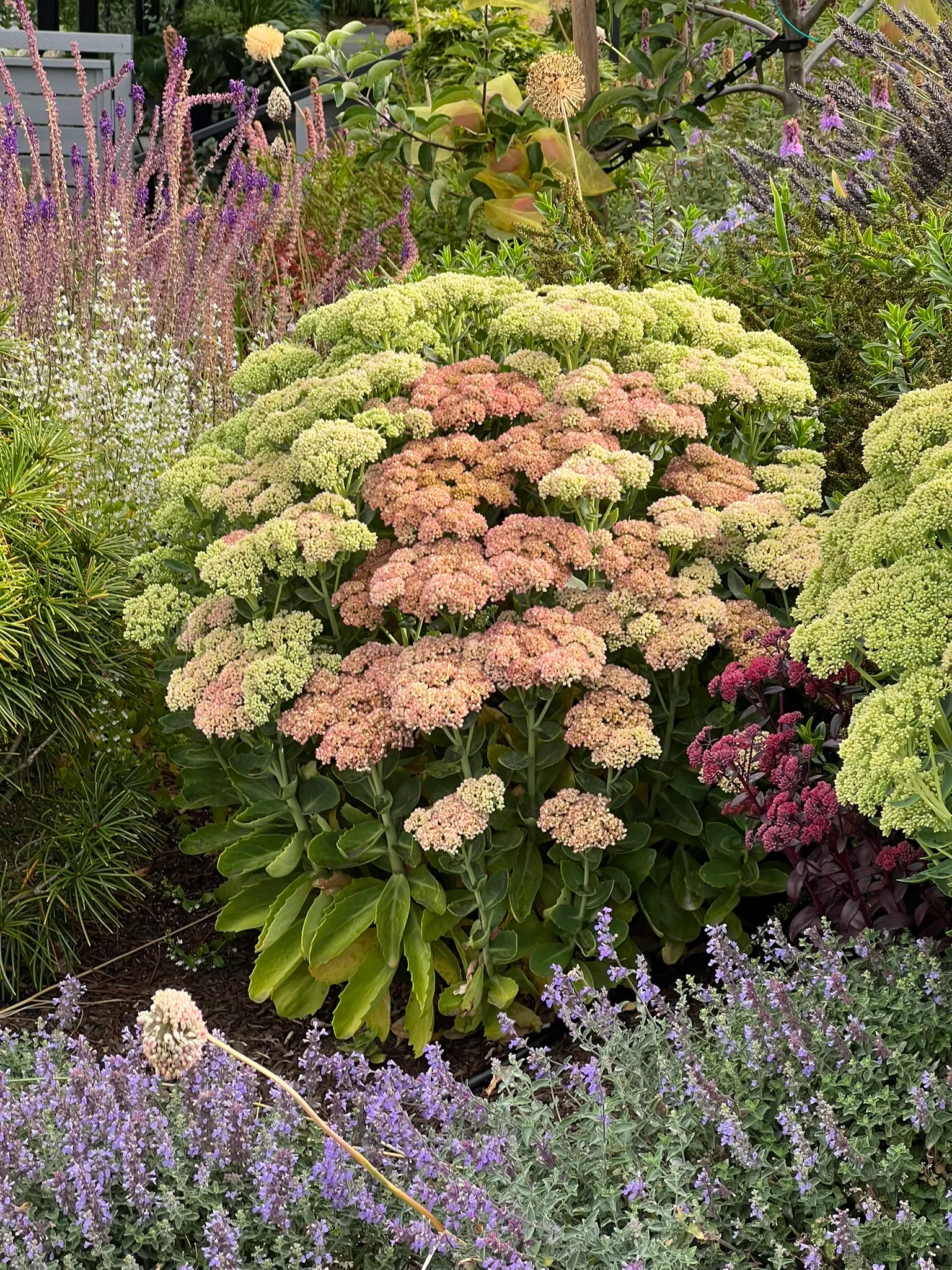 A robust, clump-forming succulent perennial in the family Crassulaceae, native to rocky slopes, hillsides, and open ground of northeastern China (Liaoning, Jilin provinces) and Korea. Currently recognized by many authorities as Hylotelephium spectabile (Boreau) H.Ohba, though the name Sedum spectabile remains widely used in horticulture. Plants form substantial clumps 18–24 inches (45–60 cm) tall and wide of thick, erect, unbranched stems clothed in whorled or opposite, broadly ovate, glaucous, blue-green to gray-green, fleshy leaves 2–3 inches (5–8 cm) long with scalloped margins. From August through September, the stems are topped with large, flat-topped cymes 4–6 inches (10–15 cm) across of masses of tiny, star-shaped, 5-petaled flowers in pink to rose-pink, opening from ornamental bud clusters. The flower heads are among the most intensely butterfly-attractive of any garden perennial. After bloom, faded seed heads turn from buff to russet-brown and persist through winter. Common cultivars include 'Brilliant' (deep rosy-pink), 'Iceberg' (white), and 'Carmen' (deep pink). Hardy to zone 3. Non-toxic.