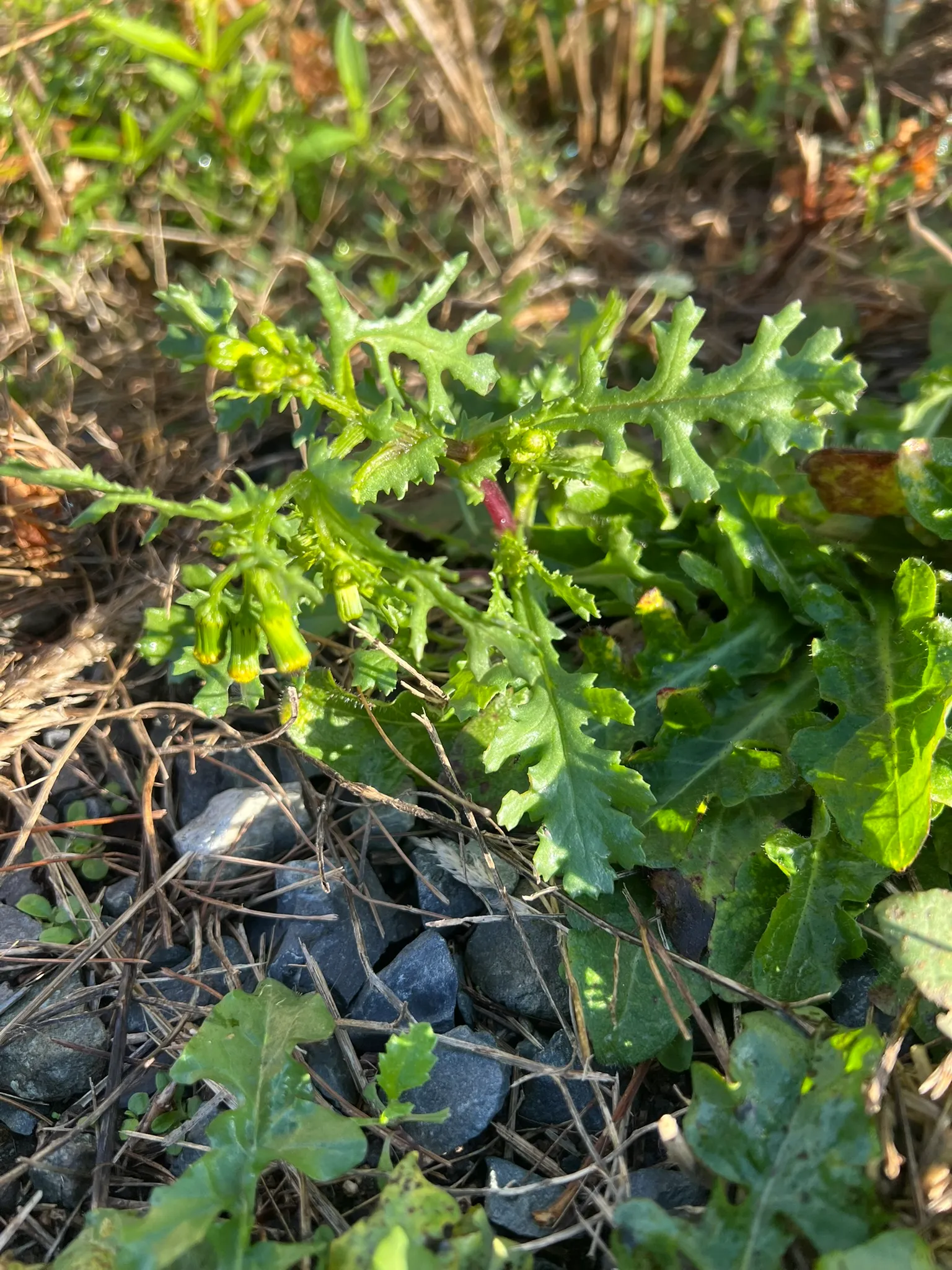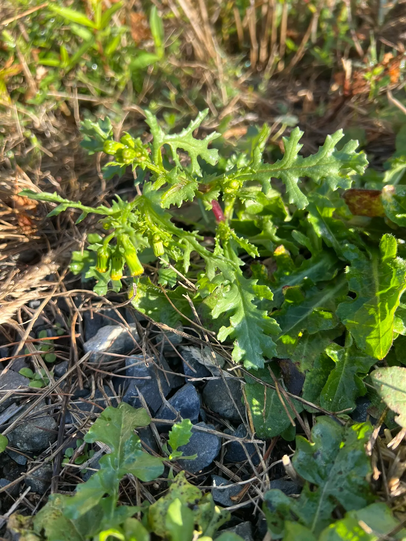 Senecio vulgaris is a low-growing, erect annual in the daisy family (Asteraceae) reaching 4–18 inches (10–45 cm) tall with a 4–10 inch (10–25 cm) spread. Stems are erect, branching, smooth to sparsely hairy, somewhat fleshy. Leaves are alternate, pinnately lobed with irregularly toothed segments, 1–4 inches (2.5–10 cm) long, clasping the stem at the base, smooth to sparsely hairy, somewhat fleshy. Flower heads are small, cylindrical, 0.3–0.4 inch (8–10 mm) long, with yellow disc florets only — completely rayless (no ray florets). Phyllaries have conspicuous black tips, a diagnostic feature shared with S. sylvaticus. Fruit is an achene with a white pappus, forming a small dandelion-like sphere at maturity. A single plant produces 1,000–15,000 seeds, dispersed by wind. The life cycle completes in 5–6 weeks, with multiple overlapping generations per year. In the Pacific Northwest, flowering and seed production occur nearly year-round. Contains pyrrolizidine alkaloids; toxic to livestock and humans. One of the most common garden weeds in the Pacific Northwest, appearing in cultivated beds, nursery containers, and disturbed ground year-round.