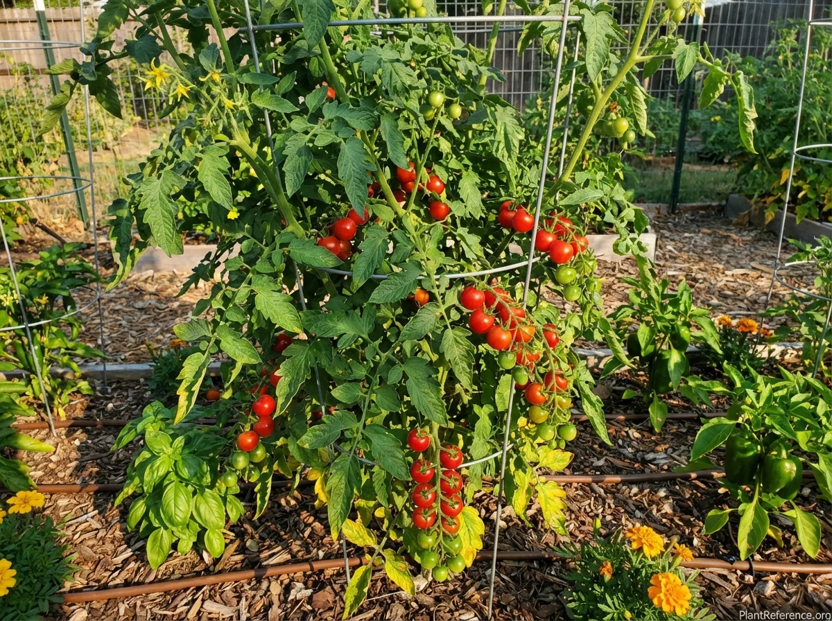 Solanum lycopersicum 'Red Cherry' thrives with consistent, deep watering 1-2 times weekly rather than frequent shallow irrigation, maintaining soil moisture through 2-3 inches of organic mulch around the base. Apply balanced fertilizer every 2-3 weeks during early growth, transitioning to lower nitrogen formulations once flowering commences to encourage fruit development over excessive foliage. Install sturdy support systems including cages or stakes at planting time to accommodate the indeterminate growth habit and heavy fruit loads. Monitor regularly for common tomato pests such as hornworms, aphids, and whiteflies, while ensuring adequate air circulation to prevent fungal diseases like early blight and powdery mildew.Pruning