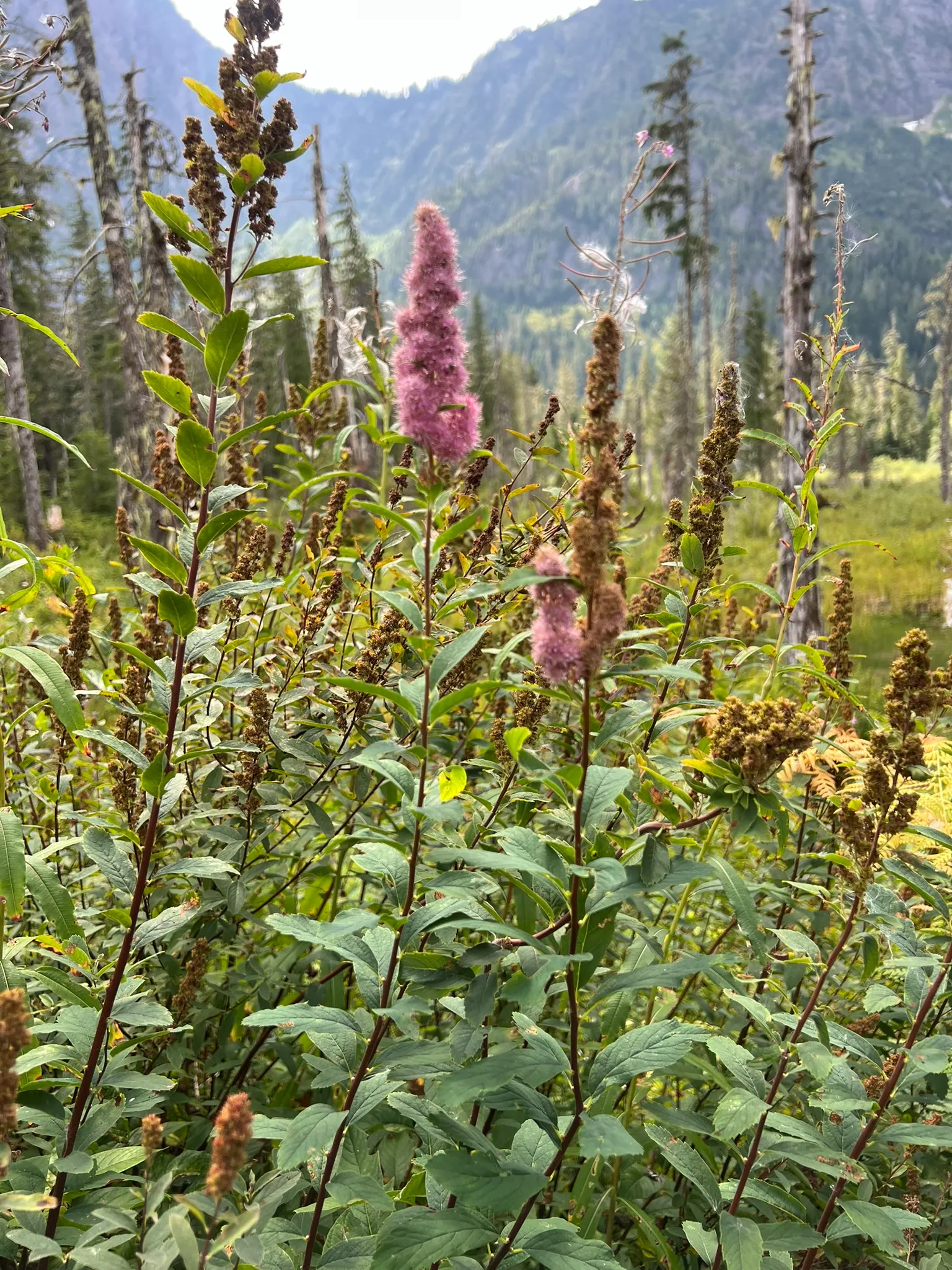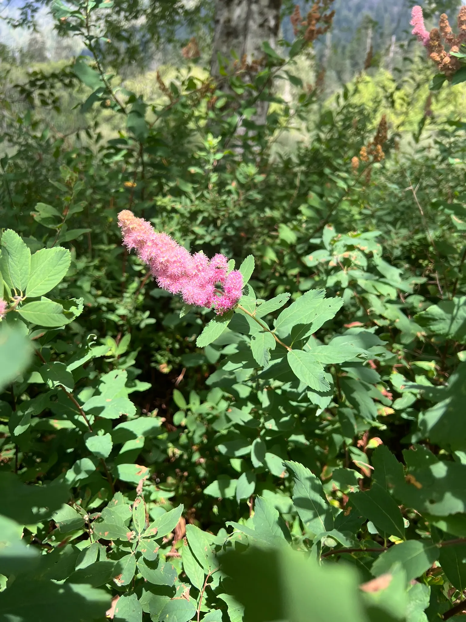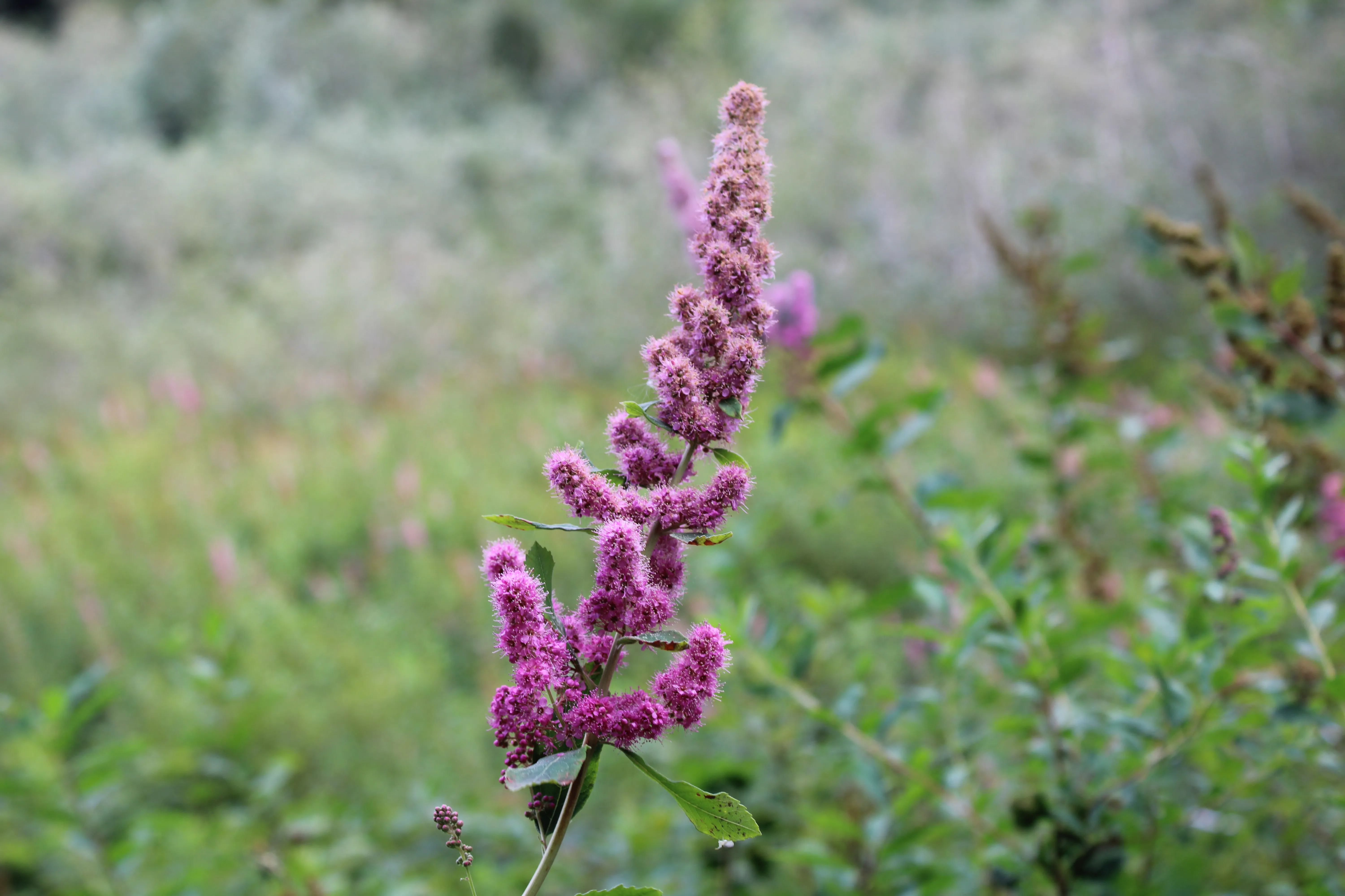 An upright, colony-forming, deciduous shrub in the family Rosaceae, native to moist meadows, stream banks, wetland edges, and moist open forest edges from British Columbia south through Washington and Oregon to California. Named for David Douglas, the Scottish botanist who collected extensively in the Pacific Northwest in the 1820s. Plants grow 3–8 feet (0.9–2.4 m) tall from spreading rhizomes forming dense colonies. The stems are upright with alternate, lance-shaped to oblong leaves 1–3 inches (2.5–8 cm) long, toothed along the upper half to two-thirds, dark green above, and conspicuously covered with dense, gray-white tomentum beneath — the gray-white woolly leaf undersides are the most reliable field character. From June through August, the upright stem tips bear dense, elongated, cylindrical to narrowly conical clusters 2–6 inches (5–15 cm) long of tiny, deep pink to rose-purple five-petaled flowers. Spreads aggressively by rhizome. Non-toxic.