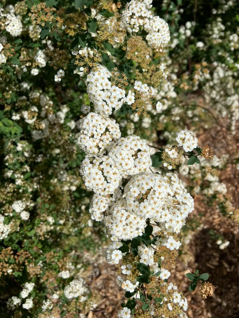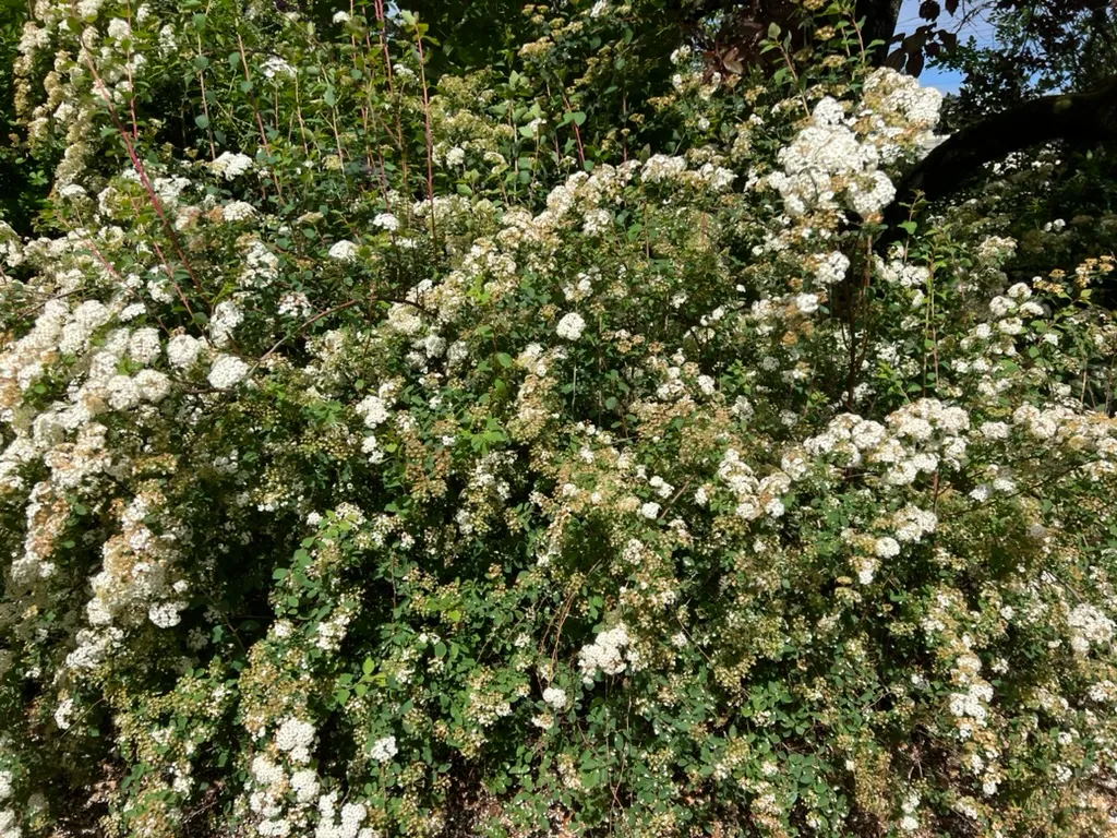 Spiraea x vanhouttei is a large, vigorous deciduous shrub reaching 6-10 feet (1.8-3 m) tall with a spread of 6-12 feet (1.8-3.7 m), developing a broad, vase-shaped to fountaining form with dramatically arching branches that sweep toward the ground. This is the largest of the commonly grown spireas and the classic 'bridal wreath' of older gardens. A hybrid of S. cantoniensis × S. trilobata, introduced in the mid-19th century. Leaves are alternate, simple, rhombic-ovate, 0.75-1.5 inches (2-4 cm) long, 3-5-lobed or coarsely toothed, dark blue-green above, blue-green beneath. Fall color is variable, typically dull yellow to brownish-purple, not a strong feature. Flowers are small, white, 5-petaled, borne in dense, rounded clusters (umbels) of 15-25 along the entire length of the previous year's arching branches in April to May. In full bloom, flowers completely obscure the foliage — the branches appear as cascading white arches, creating one of the most spectacular spring displays of any flowering shrub. Blooms on old wood. Growth rate is fast at 12-24 inches (30-61 cm) per year. Not classified as invasive. Long-lived and durable.
