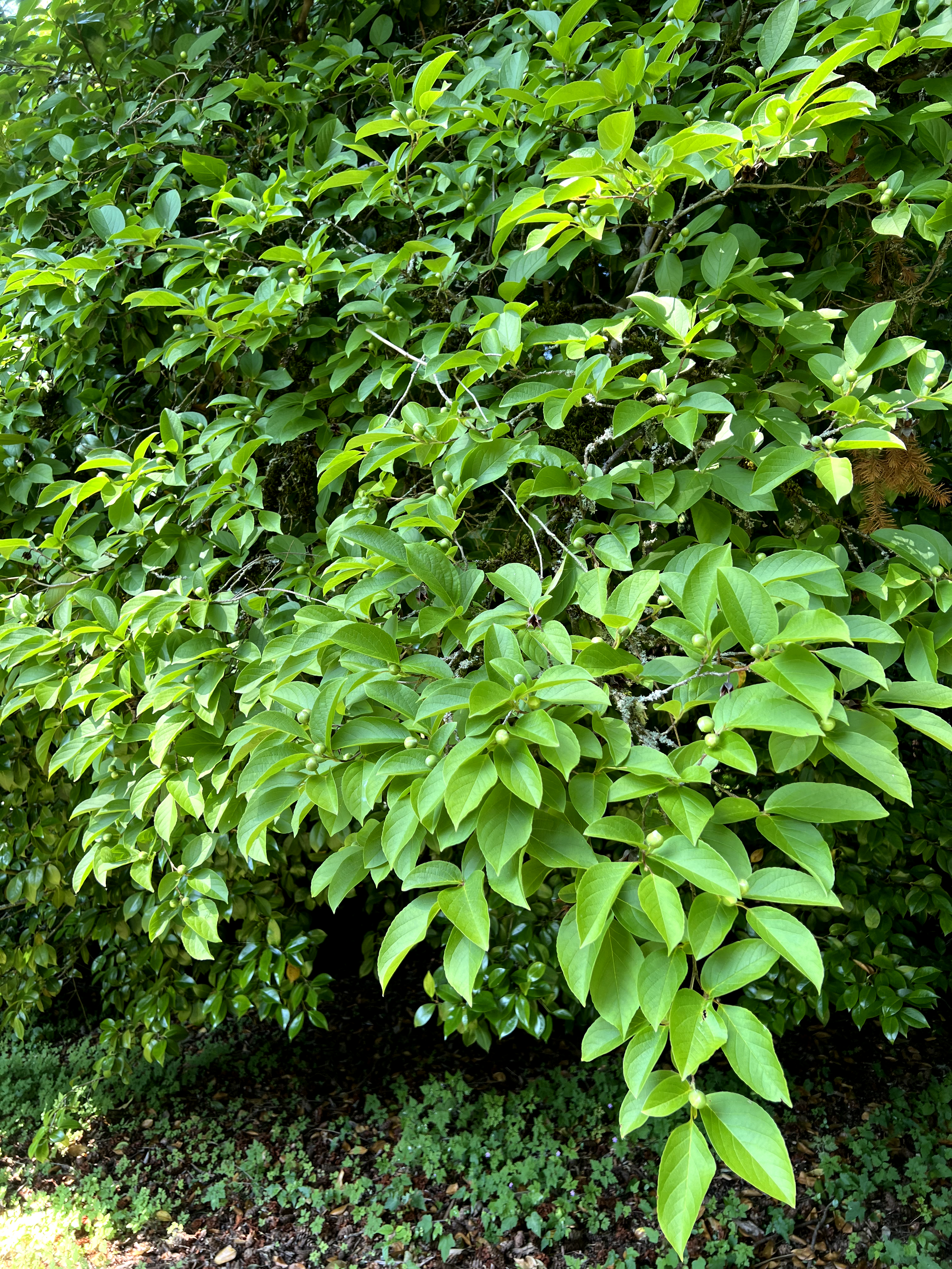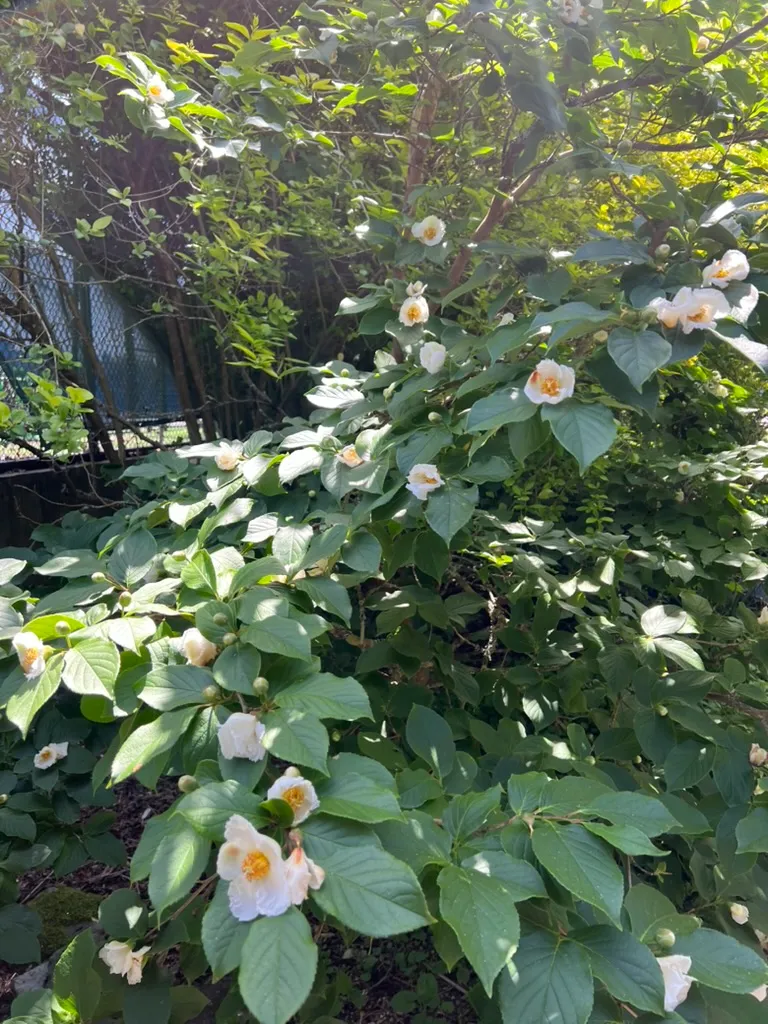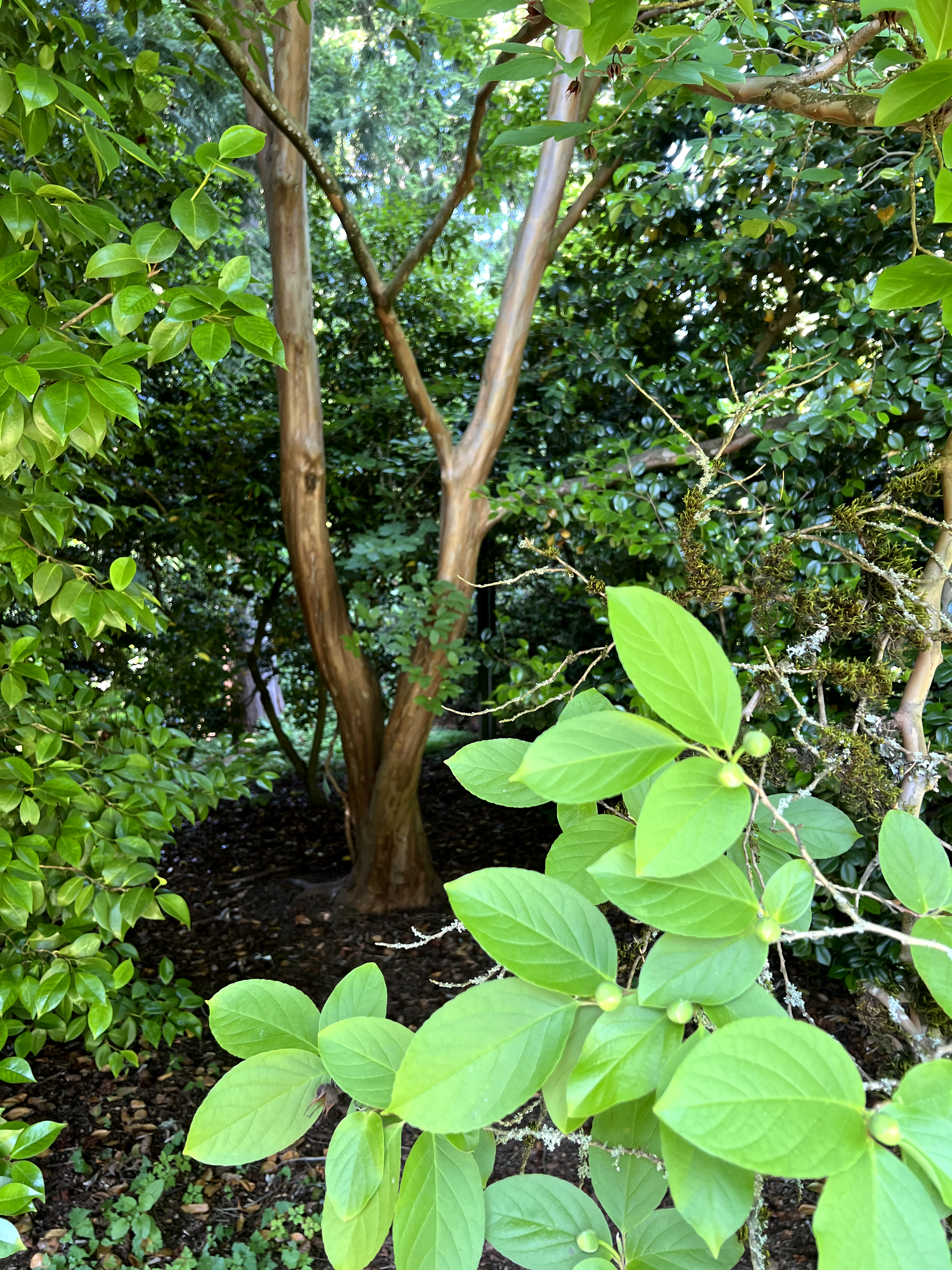 Stewartia pseudocamellia is a deciduous tree reaching 20-40 feet (6-12 m) tall with a spread of 15-25 feet (4.6-7.6 m), developing a broadly pyramidal to rounded crown. Often cited as one of the finest four-season ornamental trees available. Bark exfoliates in irregular patches to create a distinctive patchwork mosaic of gray, tan, cinnamon, orange, and cream — one of the most ornamental barks of any deciduous tree, developing with age and increasingly spectacular over time. Leaves are alternate, simple, elliptic to obovate, 2-4 inches (5-10 cm) long, dark glossy green, turning brilliant red, orange, and purple in fall — among the best fall color of any small tree in the Pacific Northwest. Flowers are white, camellia-like, 5-petaled, 2-3 inches (5-8 cm) across, with prominent yellow-orange stamens, borne singly along branches in June to July. Individual flowers last 1-2 days but open sequentially over 3-4 weeks. The species name 'pseudocamellia' (false camellia) refers to the flower resemblance. Growth rate is slow at 6-12 inches (15-30 cm) per year. Resents transplanting; establish from container-grown stock. The Pacific Northwest provides ideal growing conditions. A Great Plant Picks recommendation.