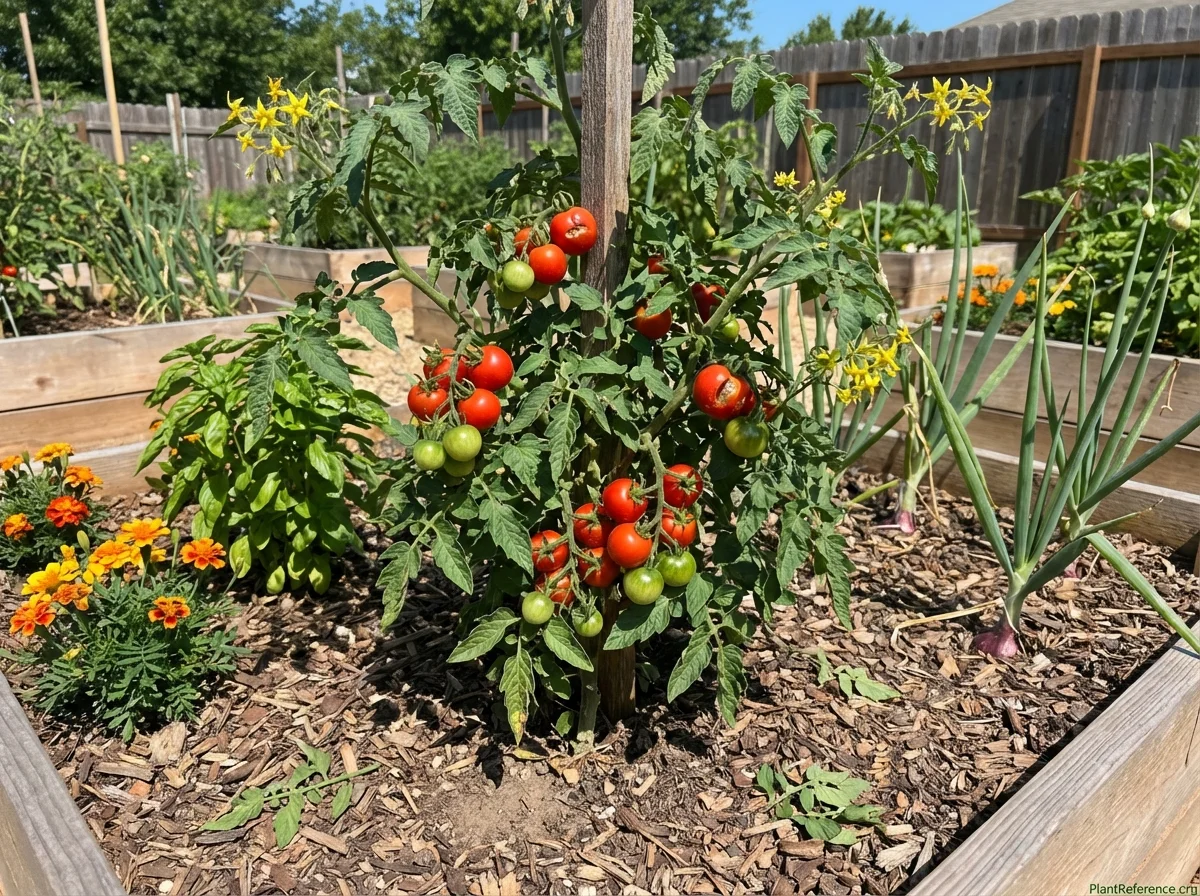Solanum lycopersicum 'Stupice' thrives with consistent deep watering and full sun exposure for optimal fruit production and superior flavor development. Provide approximately 1-1.5 inches of water weekly, watering deeply but less frequently to encourage robust root development and improve overall drought resistance during hot summer periods. Apply a 2-3 inch layer of organic mulch around plants to retain soil moisture, regulate soil temperature, and suppress competing weeds that can harbor destructive pests and diseases. Begin feeding with a balanced fertilizer (10-10-10) at transplanting, then transition to a lower-nitrogen, higher-phosphorus and potassium formula once flowering begins to promote fruit development over excessive vegetative growth. Despite their compact nature, provide sturdy support with tomato cages or stakes as heavy fruit clusters can cause branch breakage and significantly reduce harvest quality. Monitor regularly for common tomato pests including hornworms, aphids, and whiteflies, and watch for diseases such as early blight and bacterial spot, particularly during humid conditions with poor air circulation around plant bases.Pruning