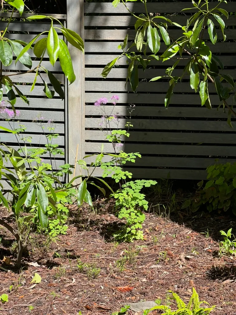 Plant in full sun to partial shade in moist, humus-rich, well-drained to average soil. Thalictrum 'Black Stockings' thrives in the cool, moist conditions of Pacific Northwest gardens. Incorporate organic matter at planting and maintain consistent moisture during the growing season — the tall stems can become floppy in very hot, dry conditions. In Pacific Northwest gardens, full sun to partial shade with regular moisture produces the strongest stems and most vibrant black coloration. Staking may be needed in exposed positions or in shadier spots where stems reach maximum height. Does not require regular division; established clumps can be left undisturbed for many years.Pruning
