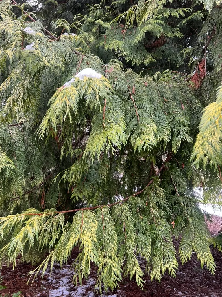 Thuja plicata 'Zebrina' is a large, pyramidal cultivar of western red cedar with cream-yellow to golden variegated foliage. Trees reach 40–60 feet (12–18 m) tall and 12–18 feet (3.7–5.5 m) wide in cultivation; growth rate is 12–24 inches (30–60 cm) per year — somewhat slower than the green species. The habit is broadly conical to pyramidal. Foliage consists of flat, fan-shaped sprays of overlapping scale-like leaves; the outer portions are cream-yellow to golden-yellow, the inner portions dark green, creating irregular alternating bands that give the cultivar its name (from the striped pattern). Foliage emits the same sweet, spicy aromatic scent as the species when crushed. The variegated pattern is most visible from a distance; the tree appears gold-tipped overall. Color intensity is highest in full sun. Bark is reddish-brown, fibrous, and peeling in strips.