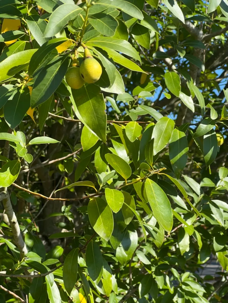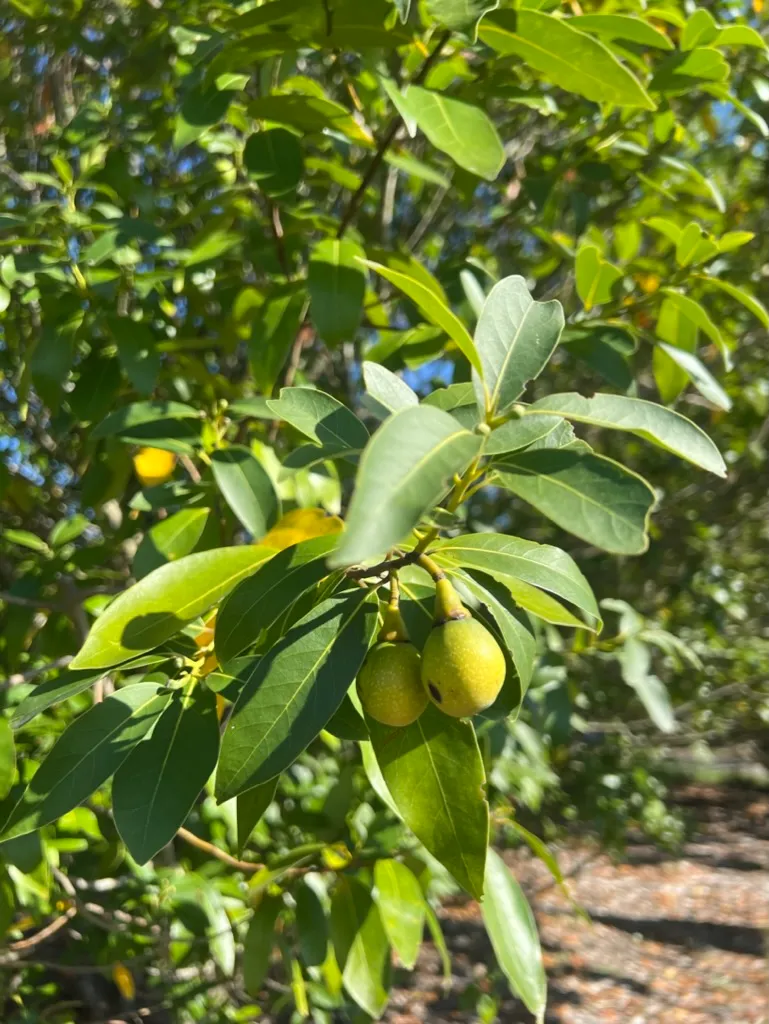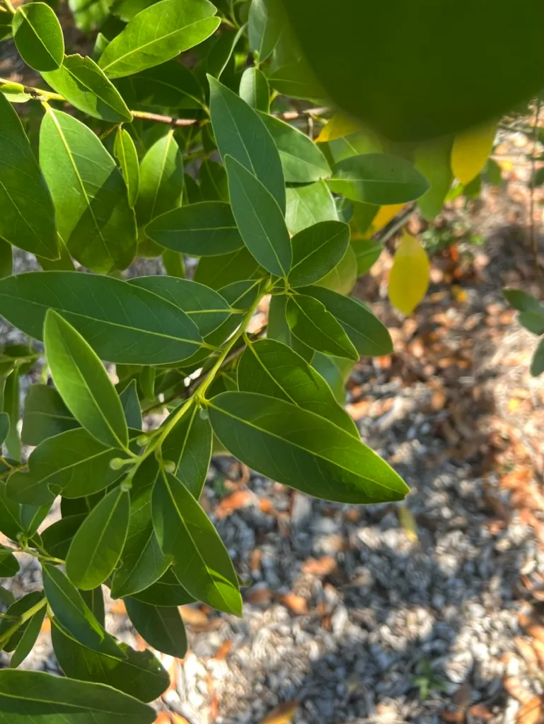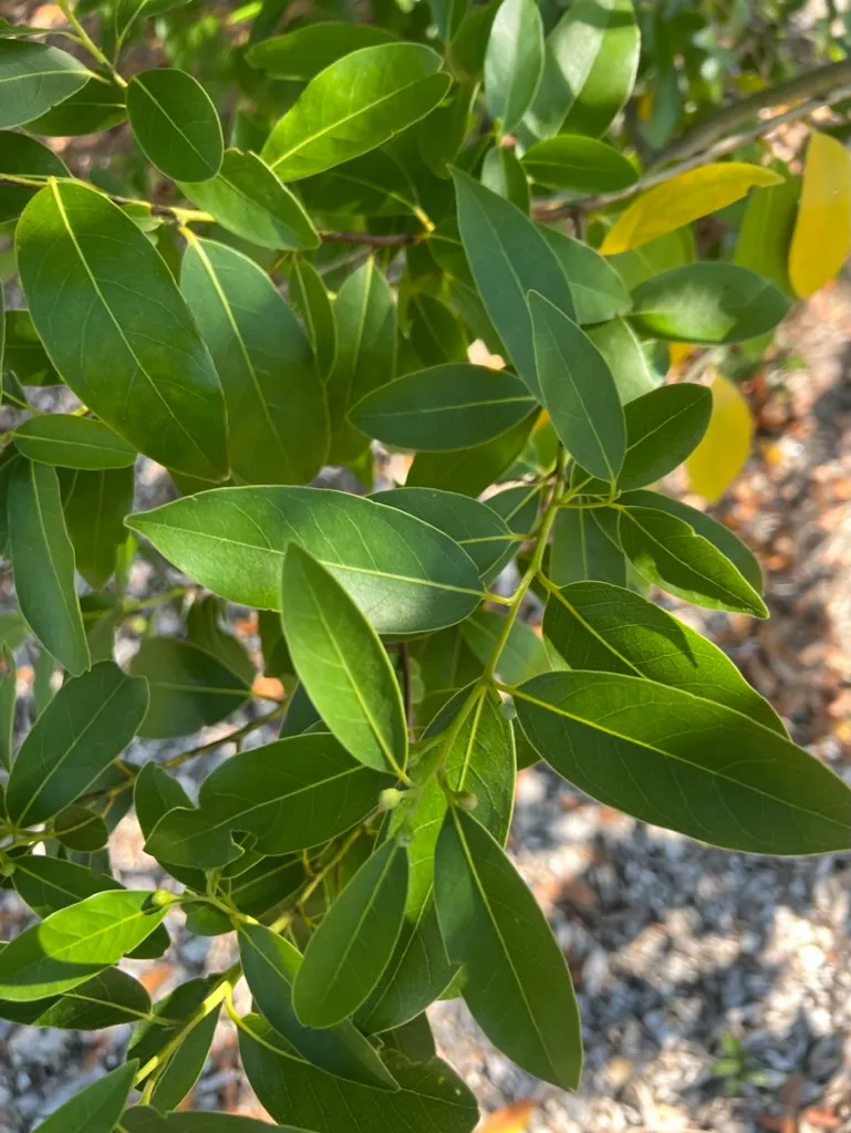 A large evergreen tree or multi-stemmed shrub reaching 40-80 feet (12-24 m) tall and 30-50 feet (9-15 m) wide at maturity in open settings, though often smaller in cultivation. The trunk is typically 12-30 inches (30-76 cm) in diameter with grayish-brown bark that develops scaly plates with age. Leaves are alternate, lance-shaped to elliptic, 3-5 inches (8-13 cm) long, thick and leathery, glossy medium to dark green, and extremely aromatic when crushed, releasing a pungent camphor-eucalyptus scent that can cause headaches in sensitive individuals when inhaled at close range. Small yellowish-green flowers appear in dense umbel-like clusters in December through March. Fruits are olive-like drupes, approximately 1 inch (2.5 cm) long, ripening from green to purplish-black in fall. Growth rate is slow to moderate, with 12-24 inches (30-60 cm) of annual growth. Trees are long-lived, reaching 200+ years in native habitats. The shallow, aggressive root system can damage nearby hardscape. In multi-stemmed form, plants sucker from the base and form thickets if not managed.