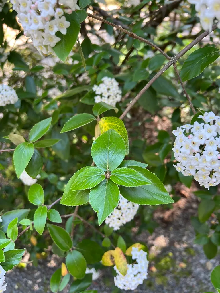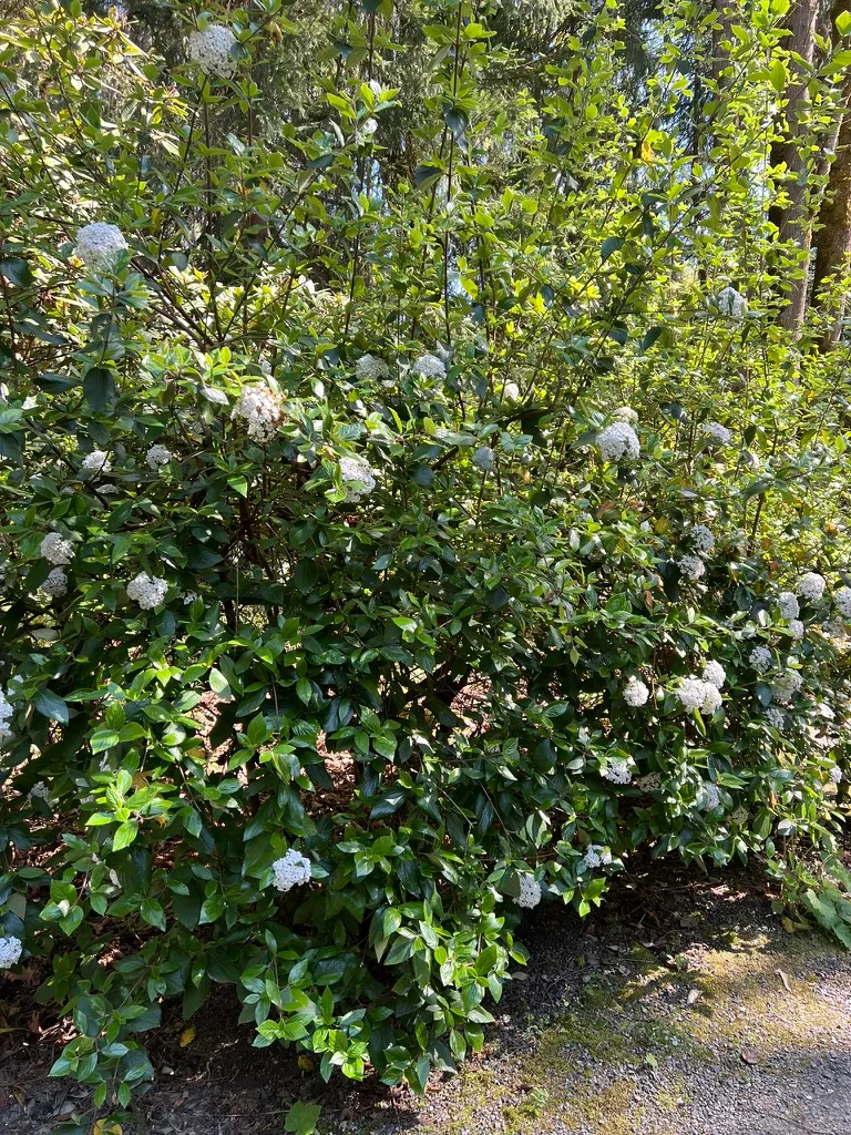 Viburnum x burkwoodii is a semi-evergreen shrub reaching 6-10 feet (1.8-3 m) tall with a spread of 5-8 feet (1.5-2.4 m), developing an upright, rounded to somewhat open form. A hybrid of V. carlesii × V. utile, raised by Burkwood and Skipwith Nurseries, England, in 1924. Leaves are alternate, simple, ovate to elliptic, 2-4 inches (5-10 cm) long, glossy dark green above, gray-tomentose beneath. Foliage is semi-evergreen in the Pacific Northwest — typically persisting through mild winters, dropping in cold spells. Fall color on deciduous leaves is dull burgundy-red. Flowers are the primary ornamental feature: pink buds open to white, intensely fragrant, borne in dense, rounded terminal clusters (cymes) 2-3 inches (5-8 cm) across in April to May. Fragrance is sweet, spicy, intoxicating — rivaling V. carlesii and carrying well through the garden. Fruit is red, ripening to blue-black, 0.3 inch (8 mm), in late summer to fall, sparse. Growth rate is moderate at 8-12 inches (20-30 cm) per year. More vigorous, larger, and more disease-resistant than the parent V. carlesii. The semi-evergreen habit provides winter structure that fully deciduous viburnums lack.