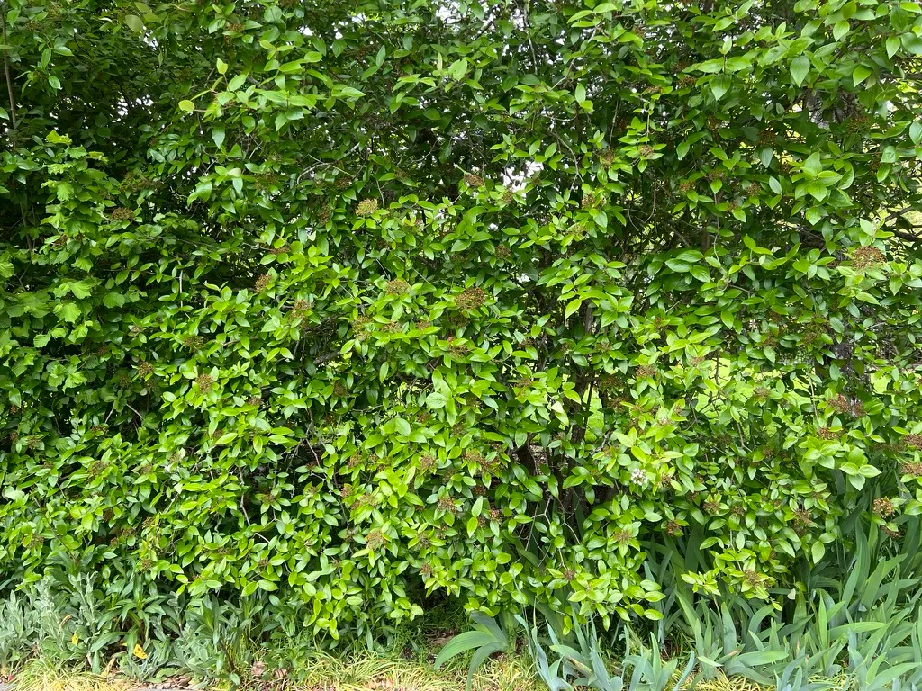 Prune after flowering in May to June. Thin oldest stems at the base every few years to maintain vigor and prevent the plant from becoming bare and leggy at the base. Shorten long stems to maintain shape. The semi-evergreen foliage means the plant has year-round presence — maintain a full, attractive form. Avoid heavy pruning in late summer through winter, which removes flower buds.Pruning Schedule
