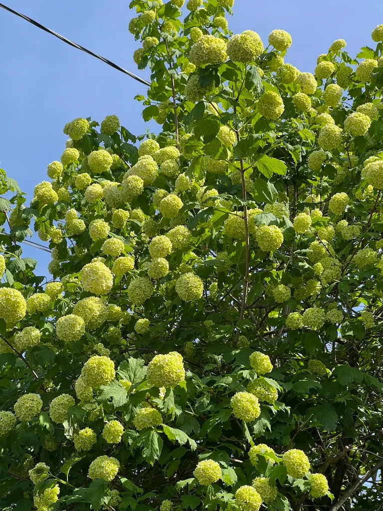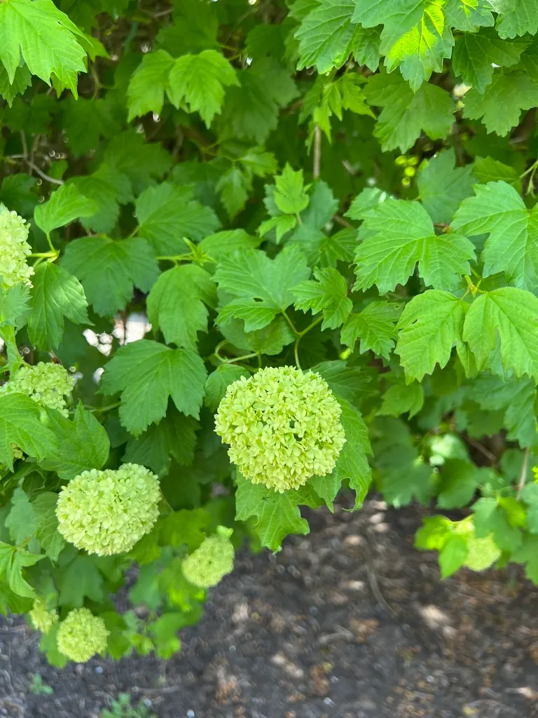 Viburnum opulus 'Roseum' (also sold as 'Sterile' or 'Snowball') is a large deciduous shrub reaching 8-12 feet (2.4-3.7 m) tall with a spread of 8-12 feet (2.4-3.7 m), developing a broad, rounded, dense form. This is the 'European snowball viburnum,' one of the oldest and most widely grown ornamental shrubs in cultivation. All flowers are sterile, forming large, round, globular clusters (snowballs) 2.5-3 inches (6-8 cm) across in May to June, opening chartreuse-green and maturing to white, then often aging to pinkish. The all-sterile flower heads are the distinguishing feature — the species has lacecap-type clusters with only a ring of sterile florets. Because all flowers are sterile, no fruit is produced, eliminating the wildlife food value of the species. Leaves are opposite, simple, 3-lobed (maple-like), 2-4 inches (5-10 cm) across, medium to dark green. Fall color is reddish-purple, variable. Growth rate is moderate to fast at 12-18 inches (30-46 cm) per year. Susceptible to viburnum leaf beetle and aphids — aphids can heavily colonize new growth and flower clusters, curling and distorting them. Good air circulation reduces pest pressure.