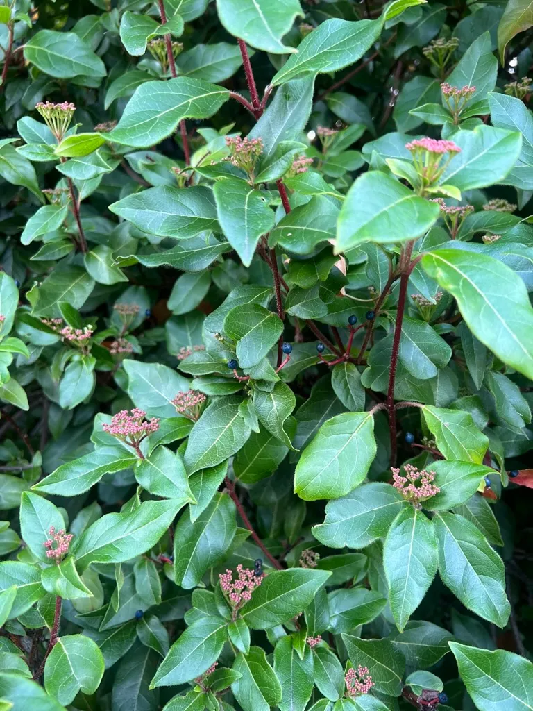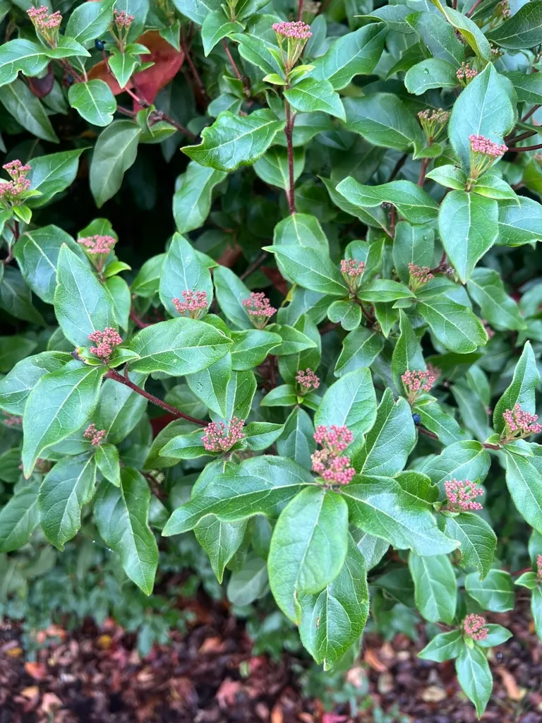 An upright to rounded evergreen shrub reaching 6-12 feet (1.8-3.6 m) tall and 6-10 feet (1.8-3 m) wide. Leaves are opposite, elliptic to ovate, 2-4 inches (5-10 cm) long, thick, leathery, and glossy dark green with a slightly lighter underside. Stems are reddish when young, maturing to gray-brown. Flower buds form in fall and persist through winter as pink to red-tinged clusters at stem terminals. Buds open to flat-topped cymes 2-4 inches (5-10 cm) across of small, fragrant, white flowers with a faint pink blush from November through April, depending on climate. Peak bloom in mild Pacific Northwest winters occurs from January through March. Fruits are ovoid, metallic blue drupes approximately 0.25 inches (6 mm) long, ripening to black, and persisting from spring into summer. Growth rate is moderate, adding 12-18 inches (30-45 cm) per year. Plants reach mature size in 5-8 years. Leaf spot and powdery mildew may develop in humid conditions with poor air circulation. Foliage can suffer burn in sustained cold below 10°F (-12°C). Plants may become semi-evergreen in zone 7 during severe winters.