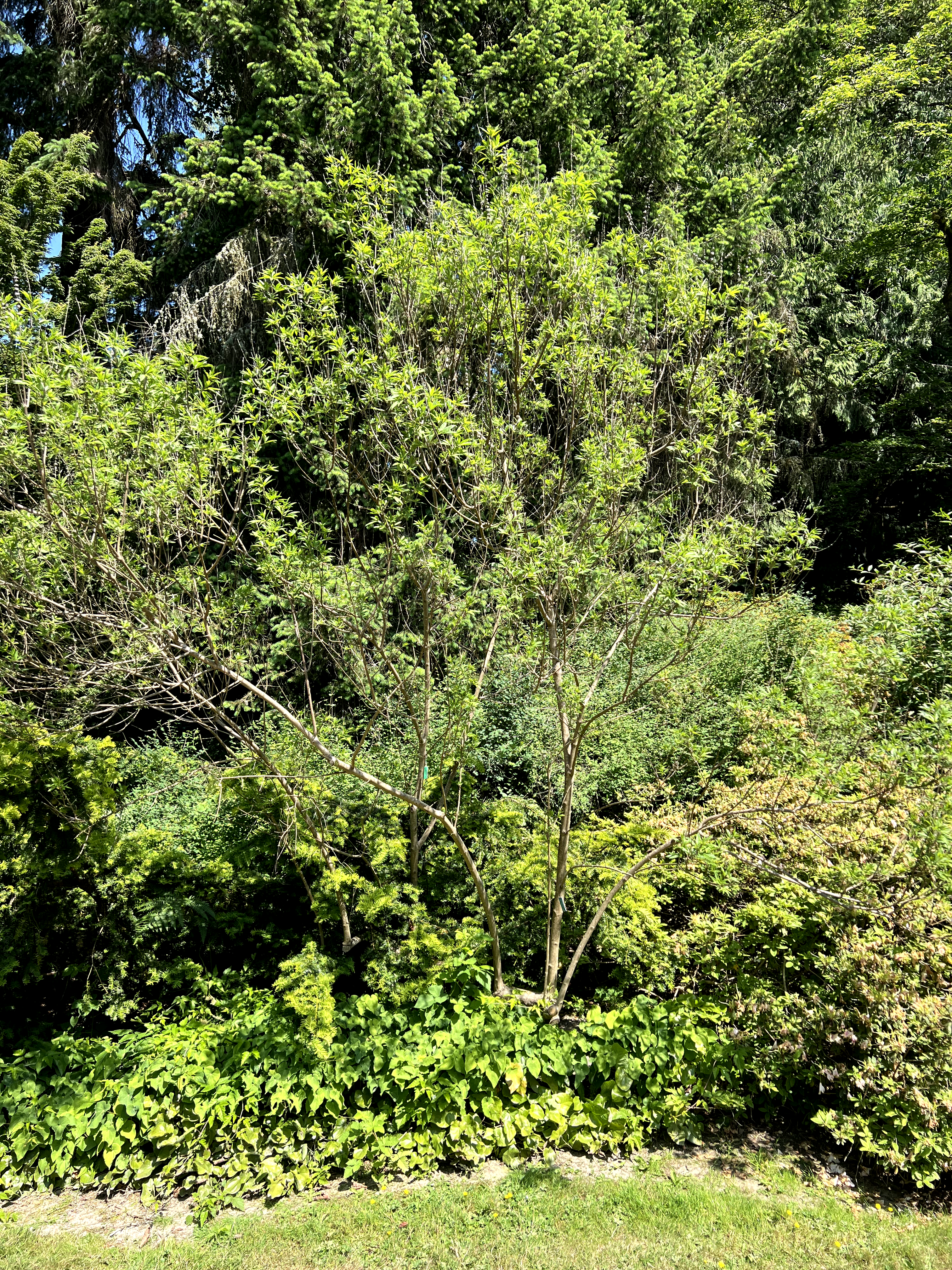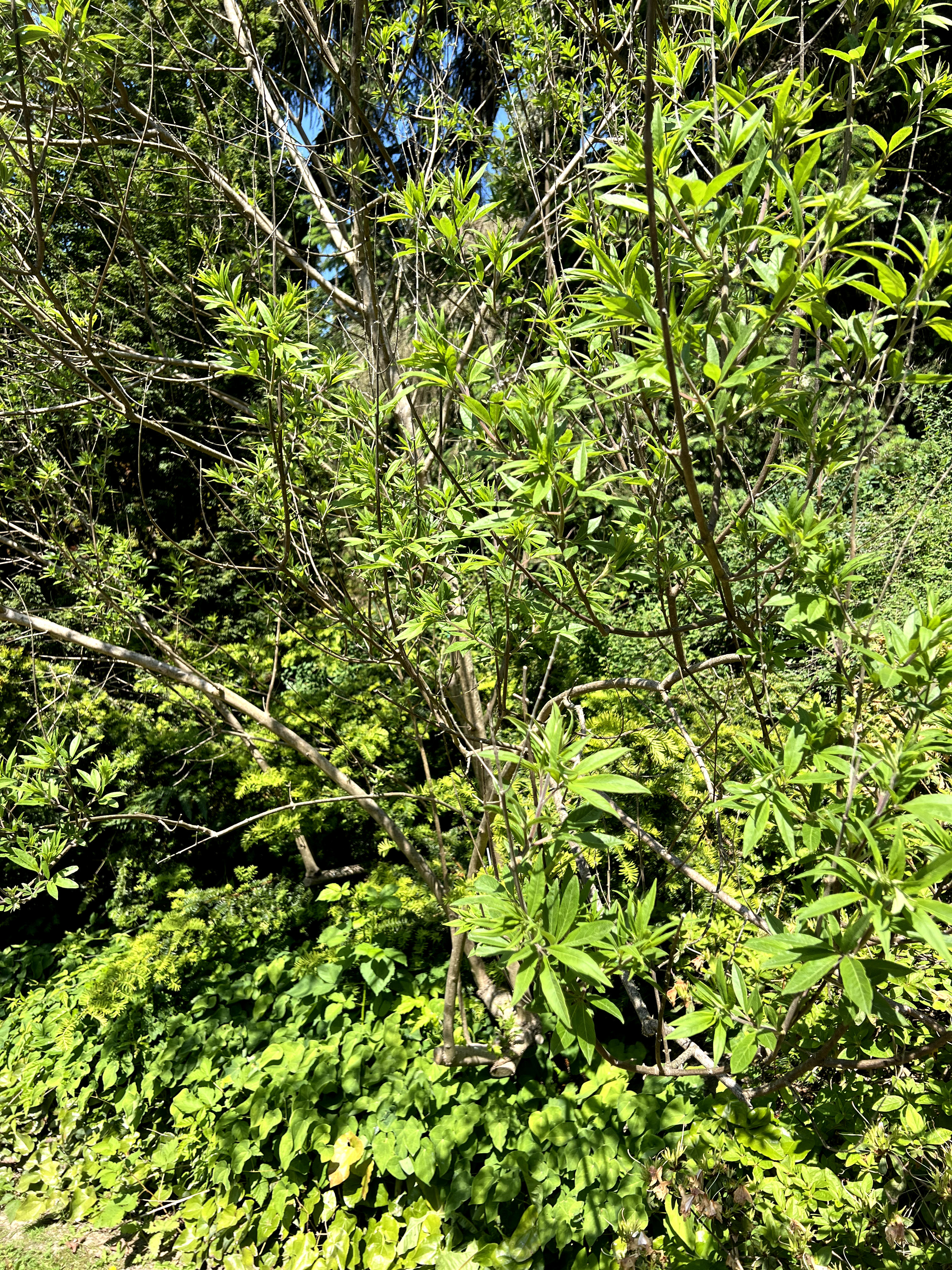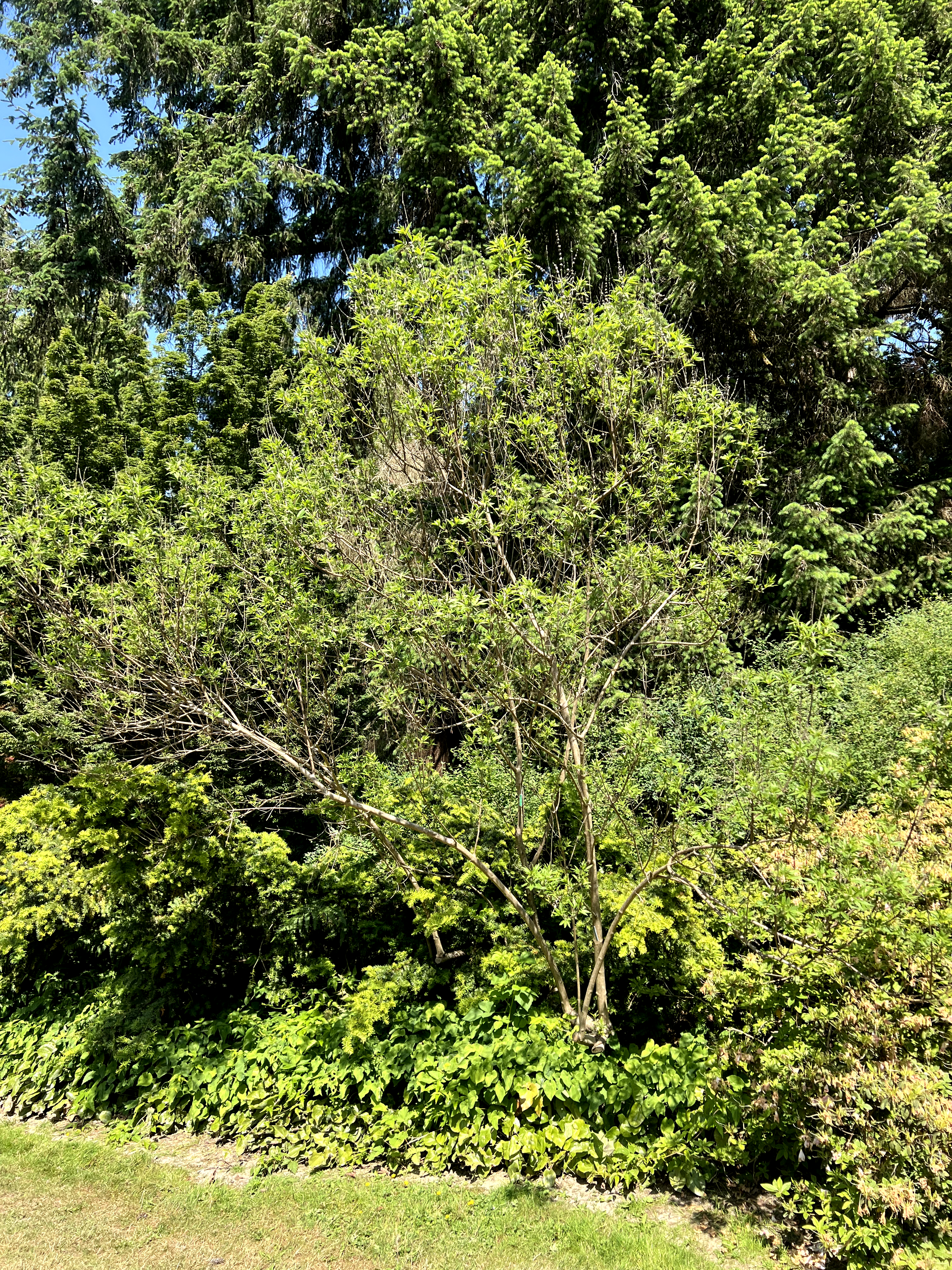 Vitex agnus-castus is a deciduous large shrub or small tree reaching 10-20 feet (3-6 m) tall with a spread of 10-15 feet (3-4.6 m), developing a broad, rounded, multi-stemmed form. Often grows as a large shrub in the Pacific Northwest; can be trained to a small tree form. Leaves are opposite, palmately compound, with 5-7 (rarely 9) narrow, lanceolate leaflets 2-6 inches (5-15 cm) long, arranged like a hand — superficially resembling cannabis (Cannabis sativa) foliage. Leaves are aromatic when crushed, with a sage-like scent. Foliage is gray-green above, gray-tomentose beneath, giving the canopy a silvery cast. Flowers are small, tubular, borne in dense, terminal, spike-like panicles 5-12 inches (13-30 cm) long in July to September — one of the latest-blooming deciduous woody plants. Flower color is lavender-blue (most common), also available in white ('Alba') and pink ('Rosea'). Flowers attract bees and butterflies heavily. Fruit is a small, round, gray-brown drupe. Growth rate is fast at 12-24 inches (30-61 cm) per year. In the Pacific Northwest, may die back to the ground in cold winters west of the Cascades; regrows and blooms on new wood. Performs best in the warmest microclimates or east of the Cascades. In the Lamiaceae (mint family), formerly placed in Verbenaceae.