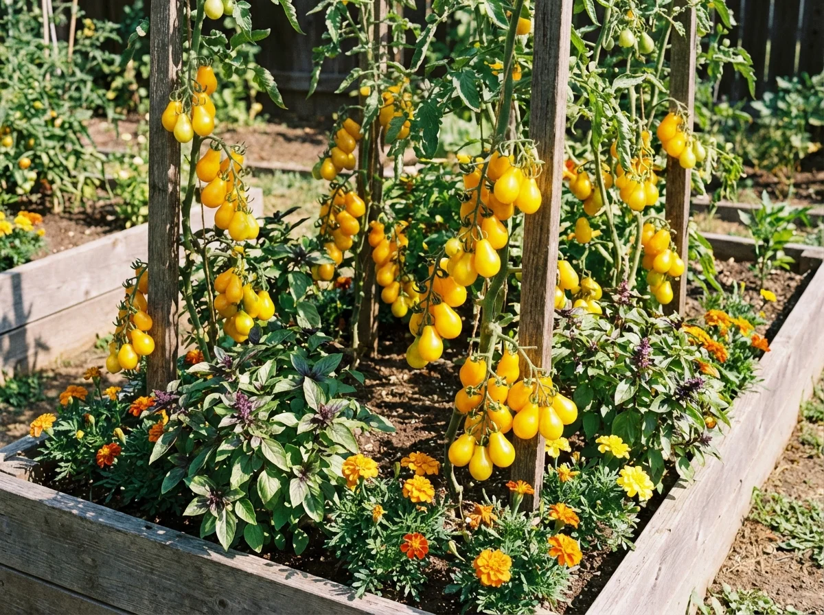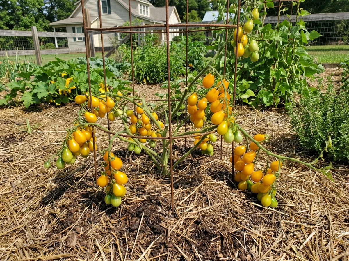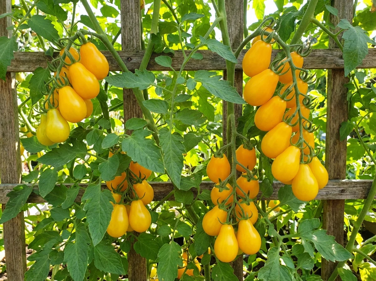 Solanum lycopersicum 'Yellow Pear' requires consistent moisture throughout the growing season, needing deep watering 2-3 times per week or daily during hot, dry periods. Provide strong support with cages, stakes, or trellises as plants can reach 6-8 feet tall. Feed regularly with balanced fertilizer every 2-3 weeks, switching to lower nitrogen formula once flowering begins to encourage fruit production. Mulch around plants to retain moisture and suppress weeds. Remove suckers that develop in leaf axils to direct energy into fruit production and improve air circulation.Pruning